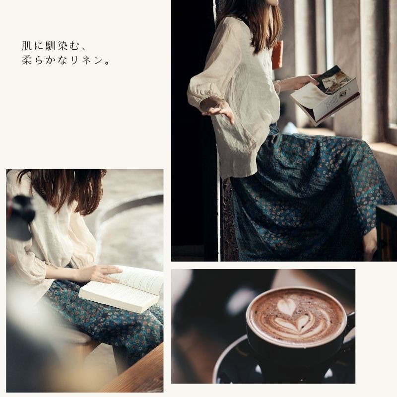 リネンシャツとレトロ小花柄プリントスカートのセット W01333