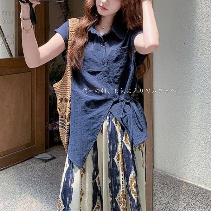 ブルーアシメシャツ&レトロプリント柄ワイドパンツのセット W01336