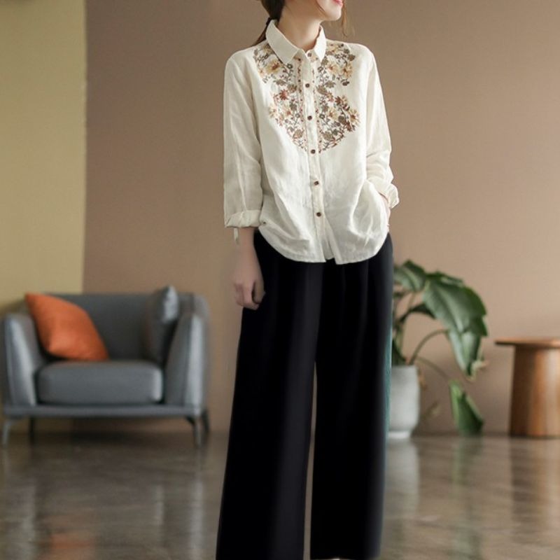 フラワー刺繍ピュアリネンシャツ 5color A00909