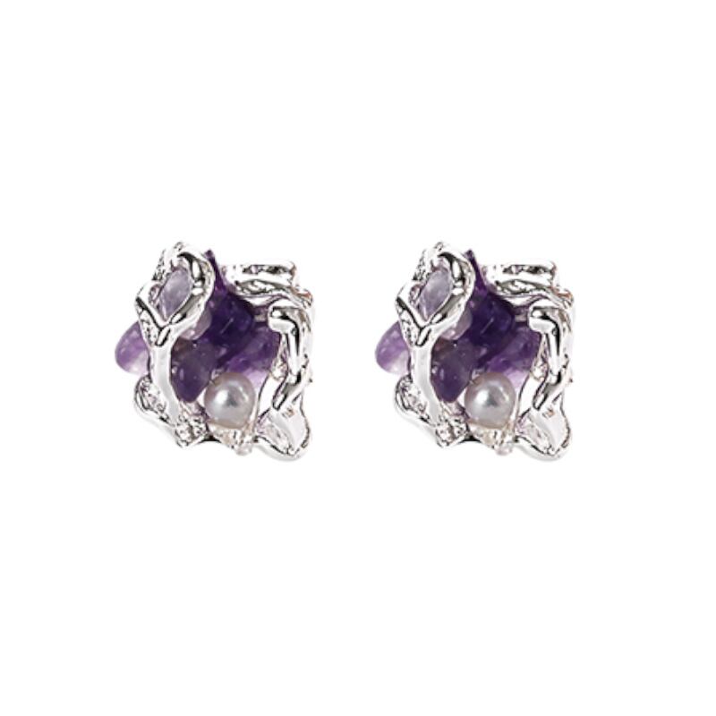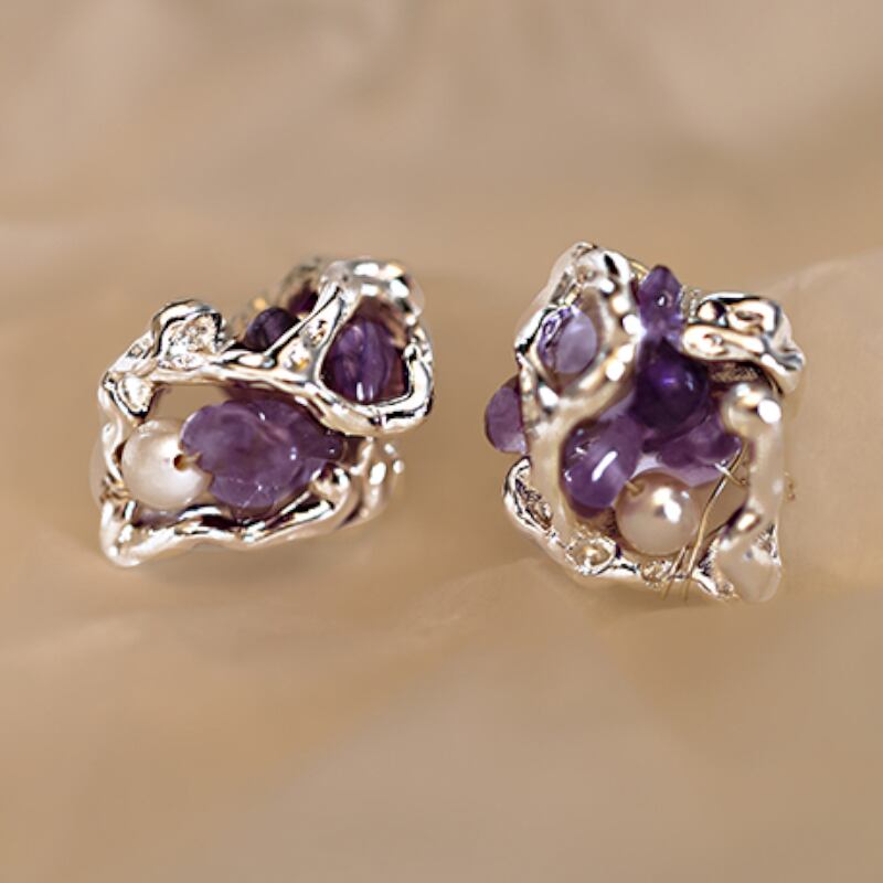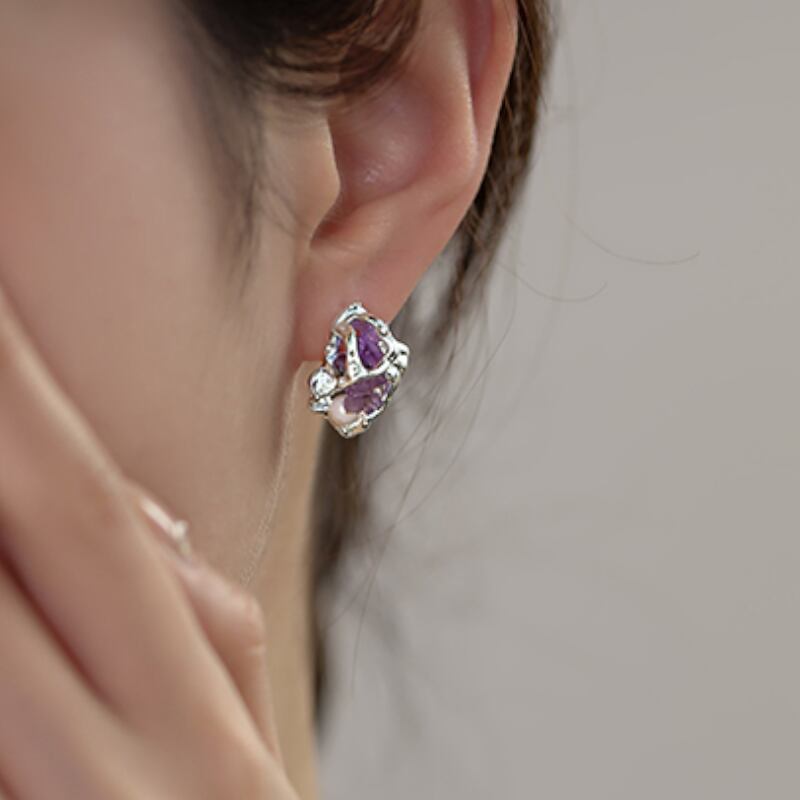 アメジストとパールの繊細な輝きが魅力のピアス。