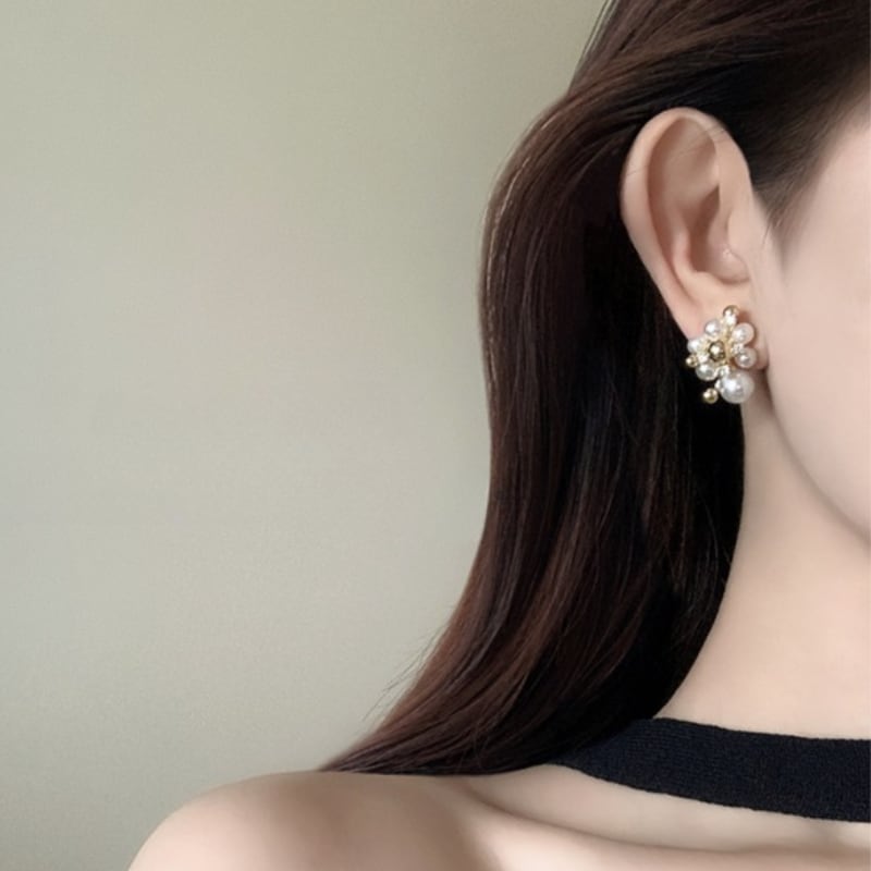複数パールと球状ビジューが煌めく、クラスタデザインのピアス。