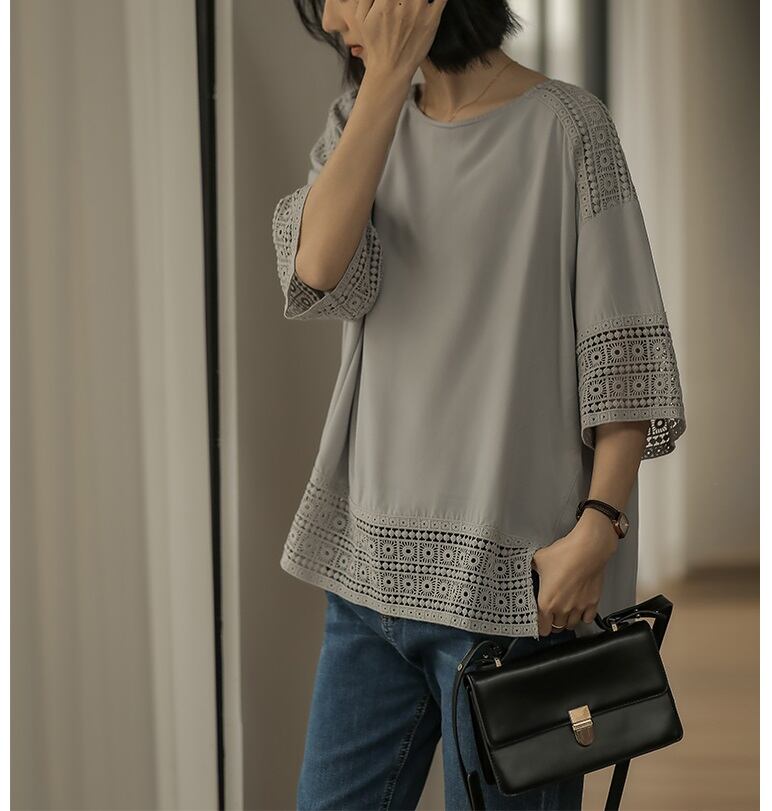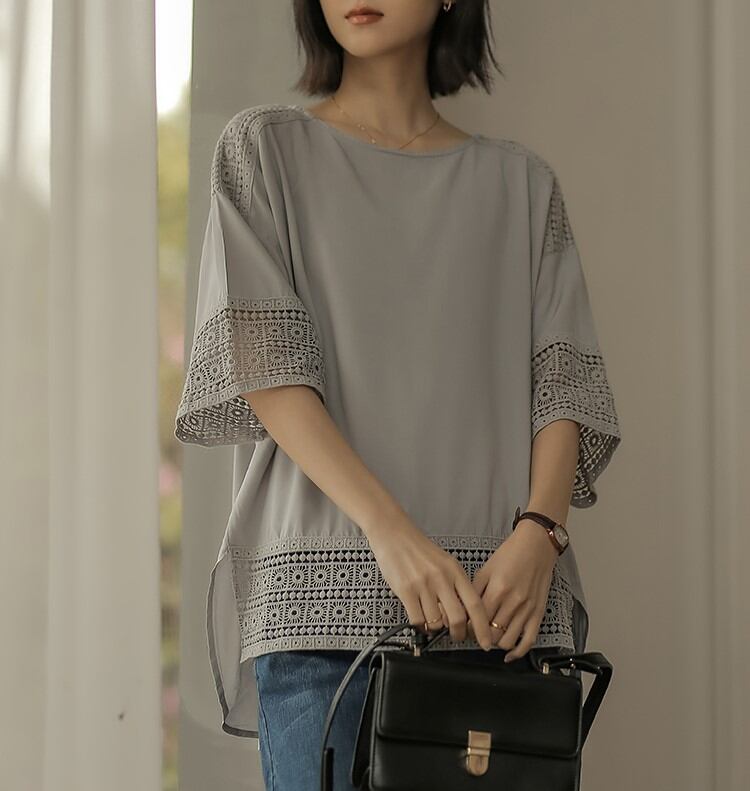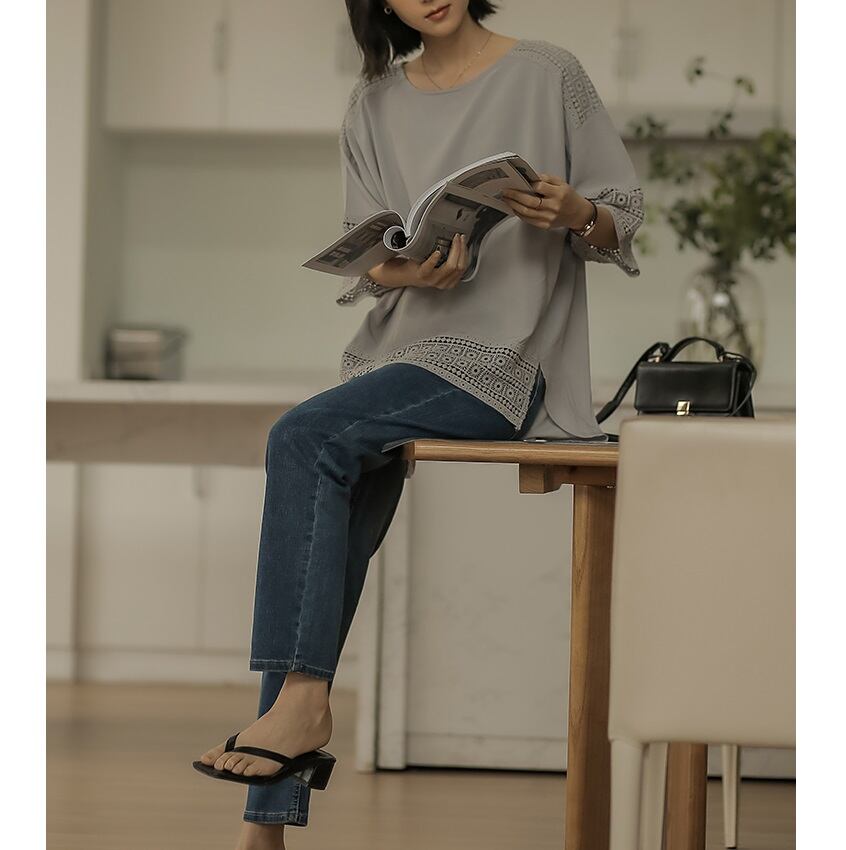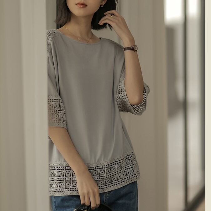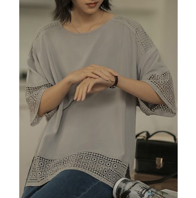 裾のレースがさりげないアクセントとなり、カジュアルなボトムスからスカートまで幅広くコーディネート可能です。