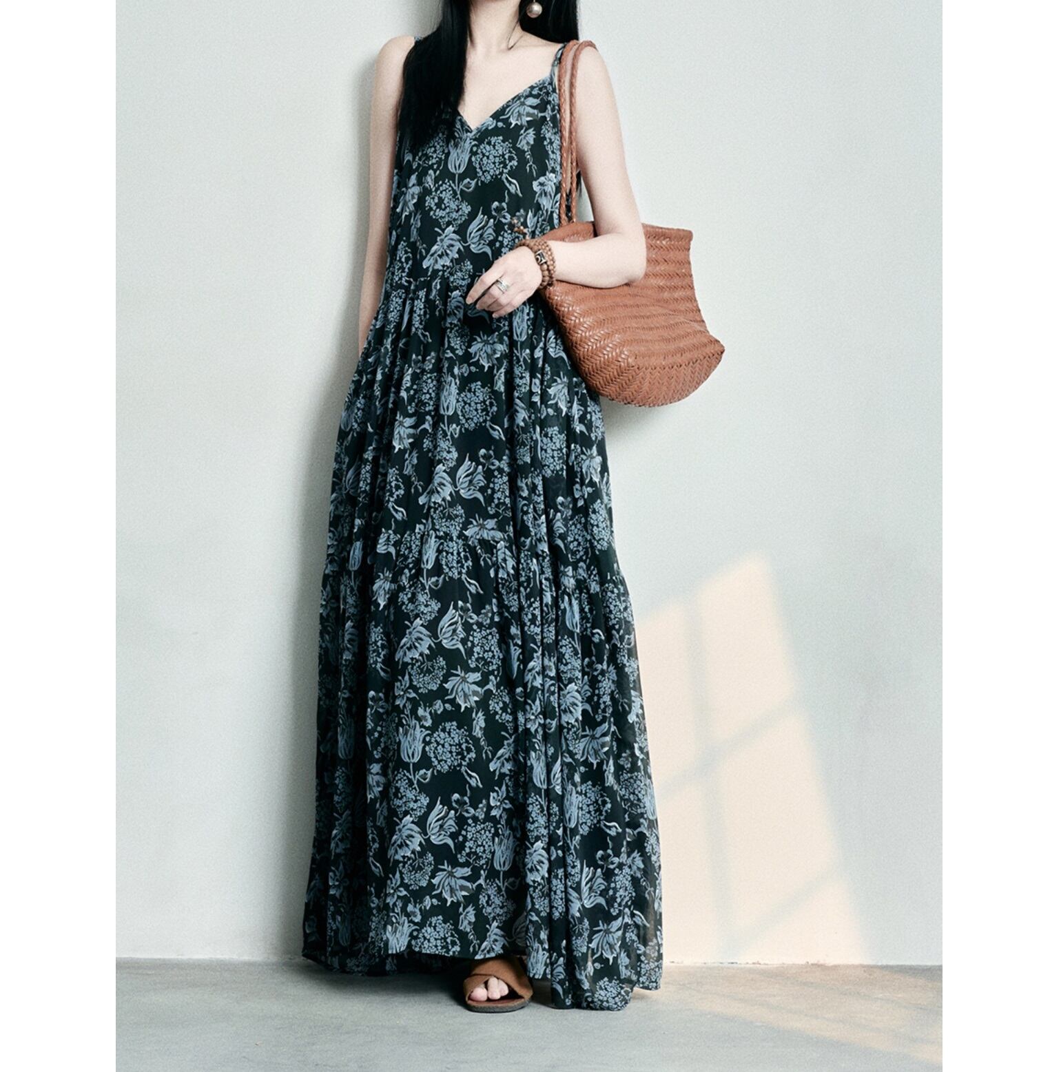 深い青色の花柄プリントが印象的な、マキシ丈Aラインワンピース。