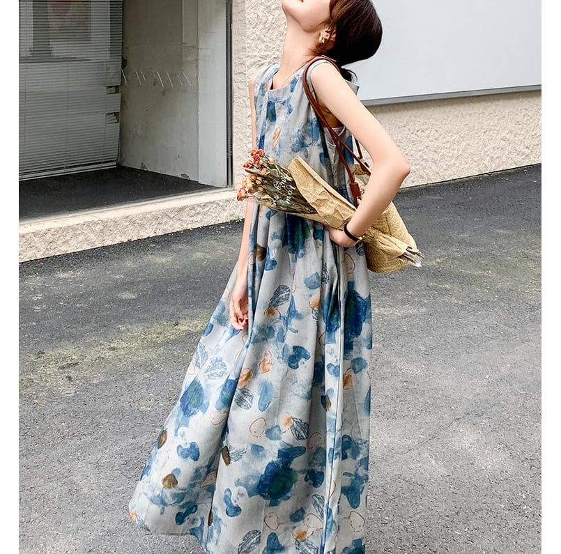 ノースリーブブルー水彩プリントワンピース A01306