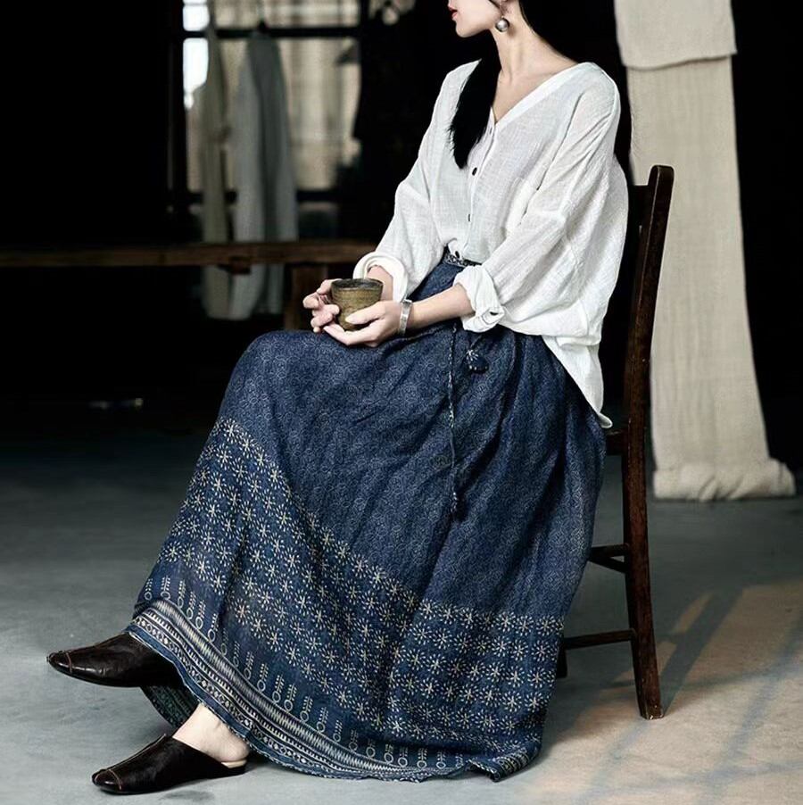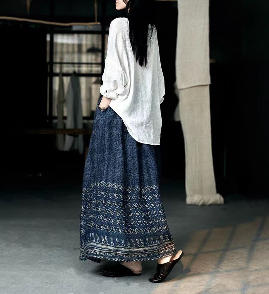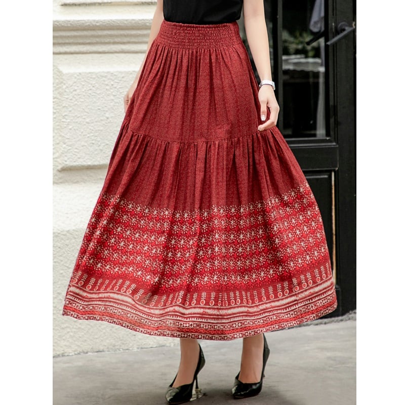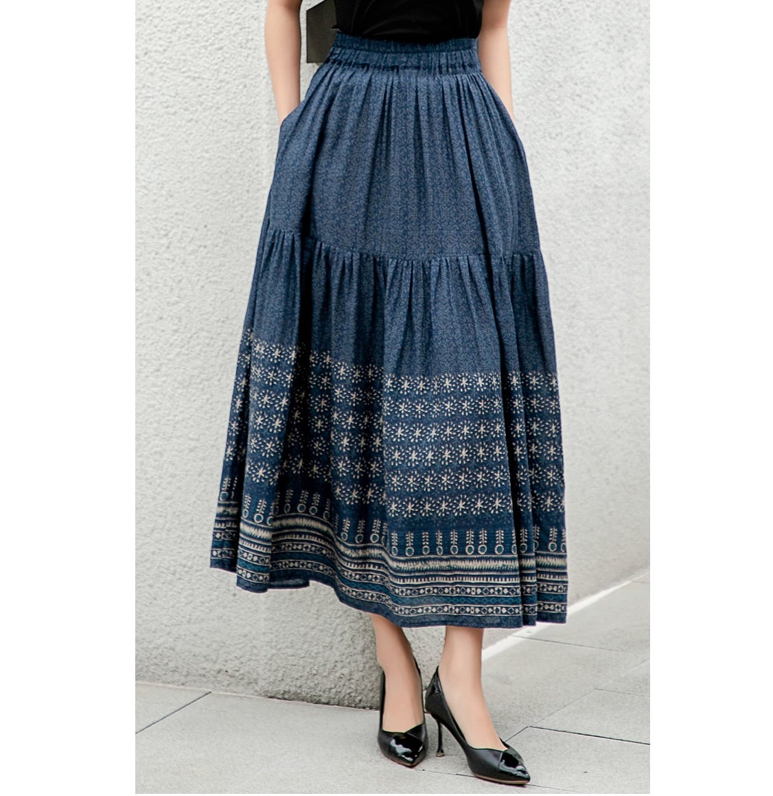 ウエストゴムとコットン生地で着心地のよいAラインマキシ丈スカート。