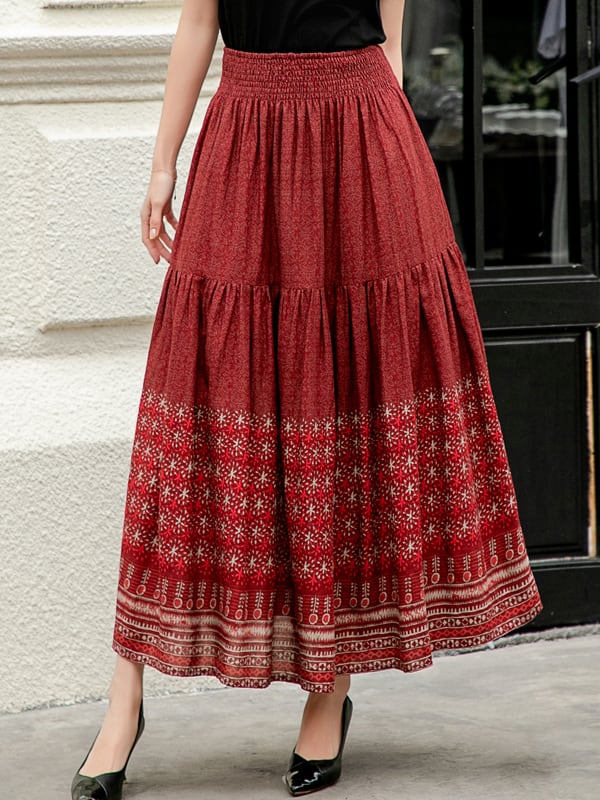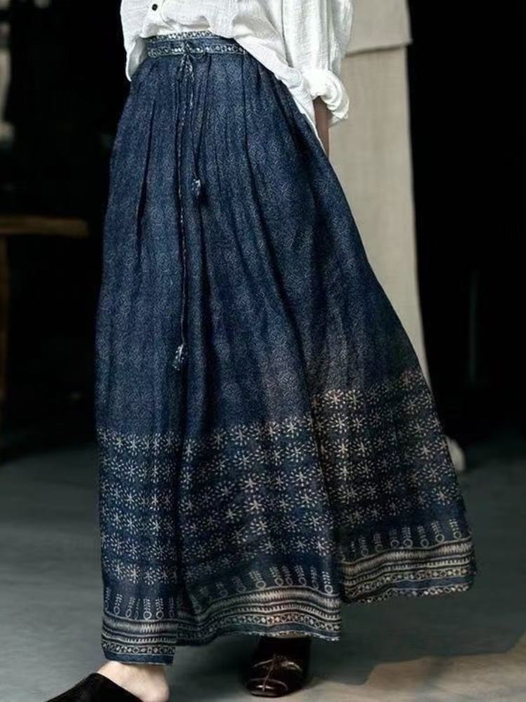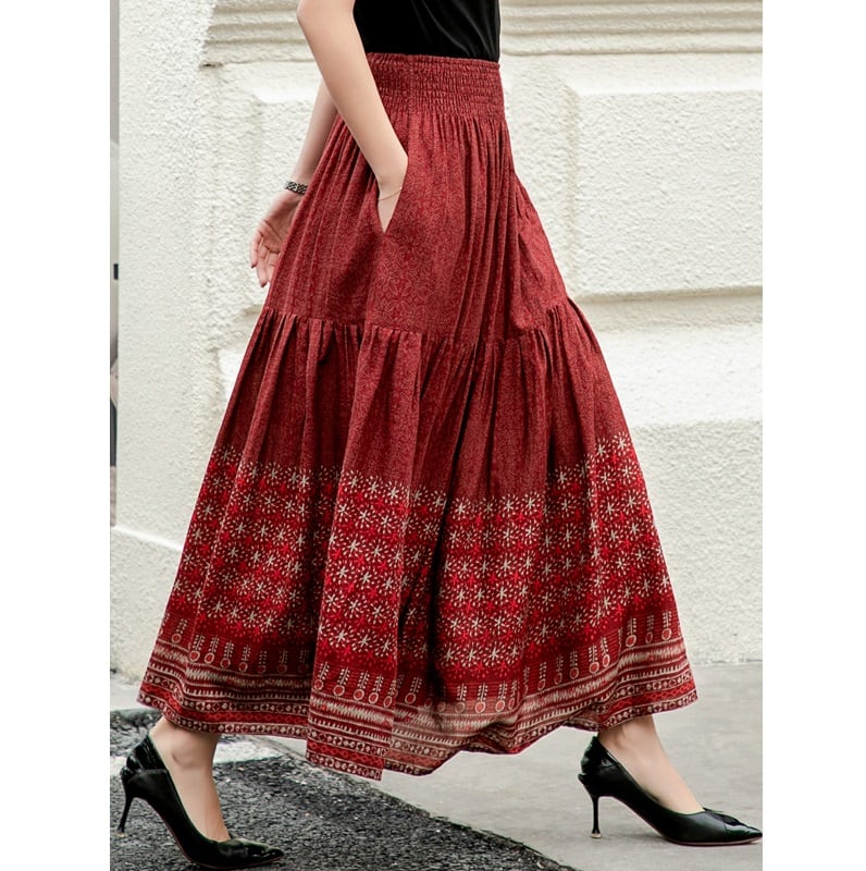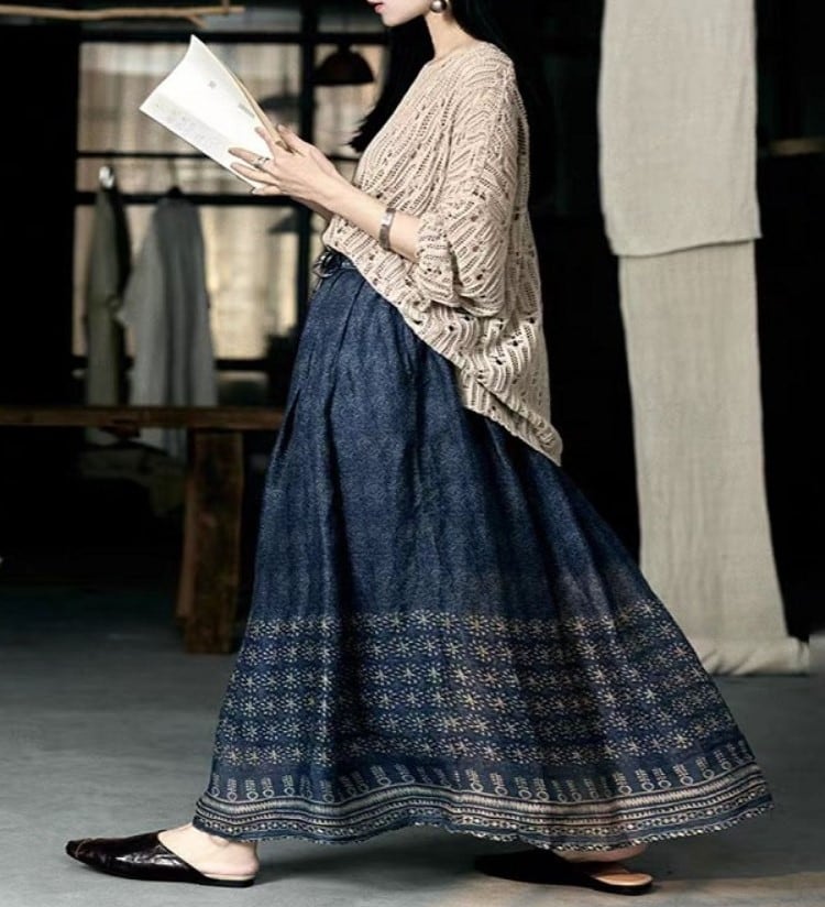 レトロ調のプリント柄が歩くたびに揺れ動き、女性らしい優しさと軽やかさを演出します。