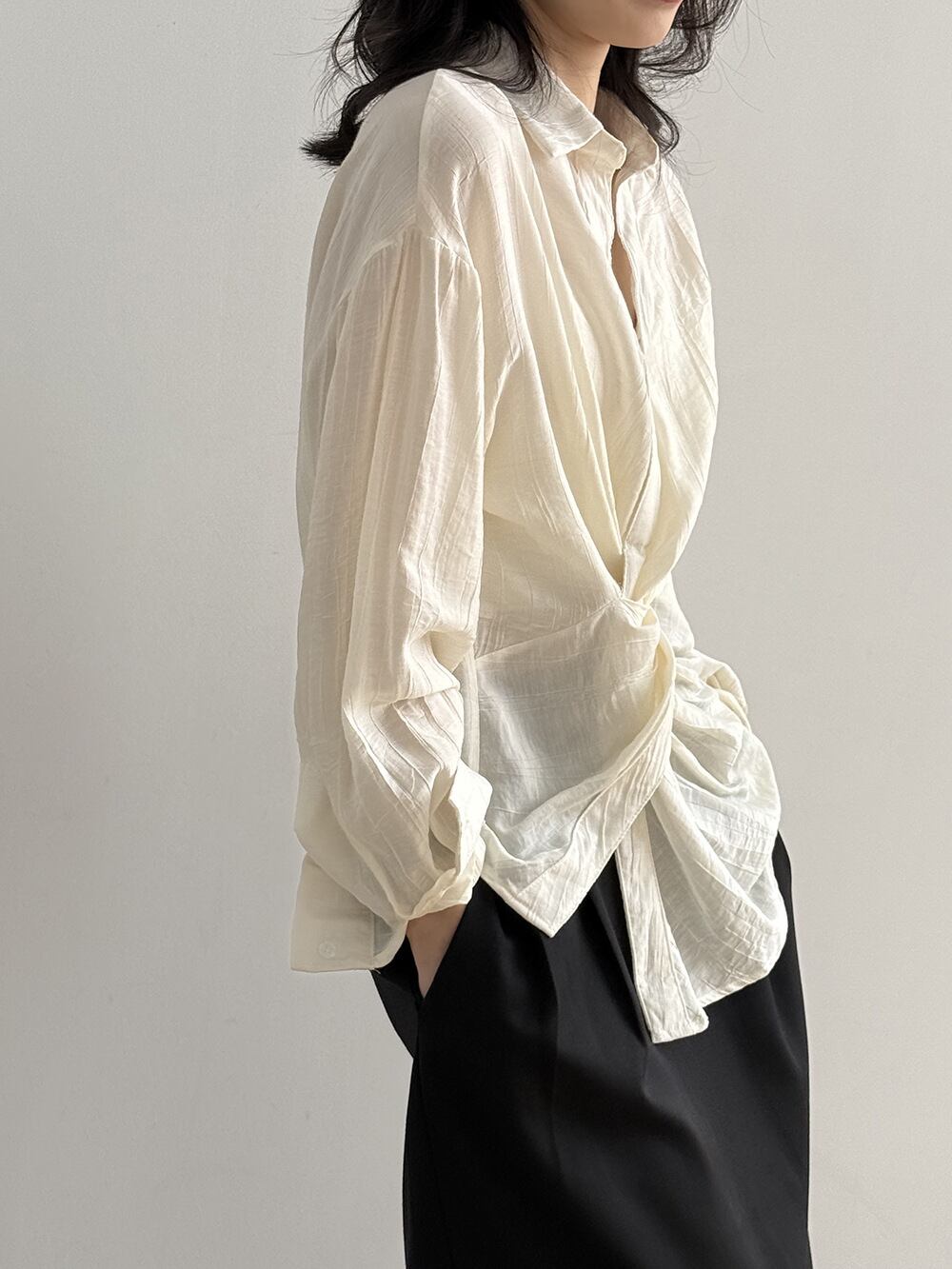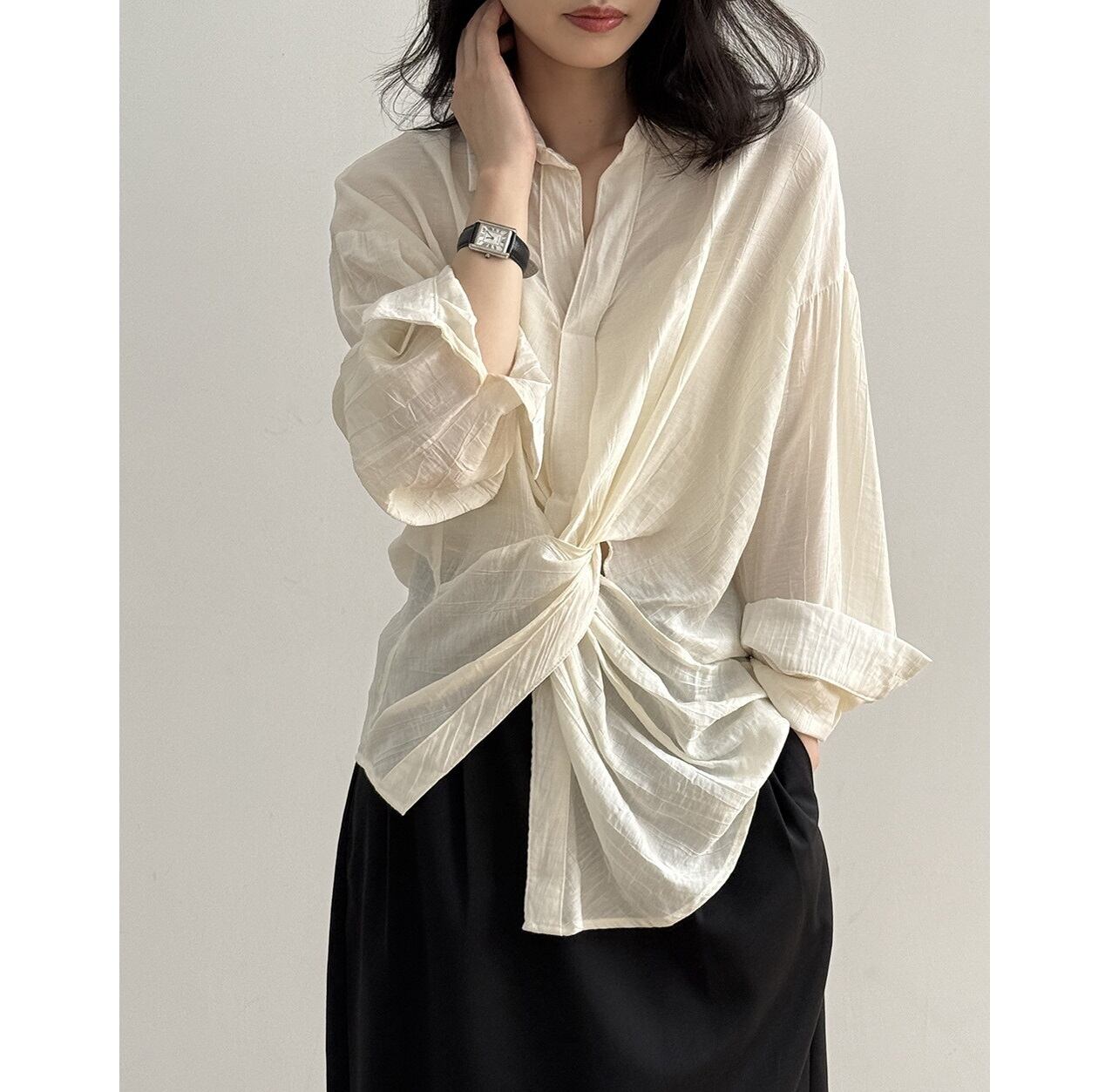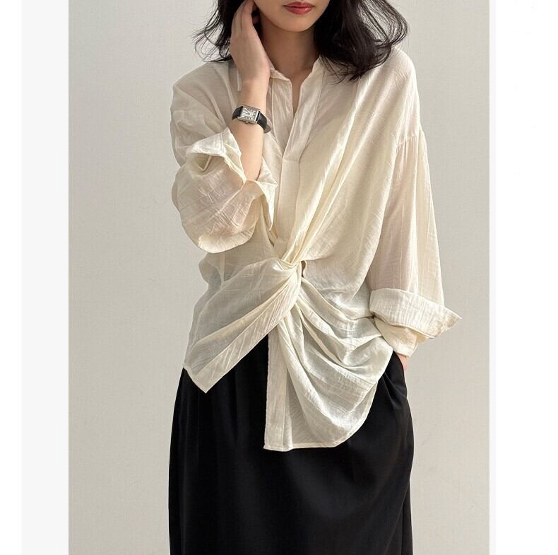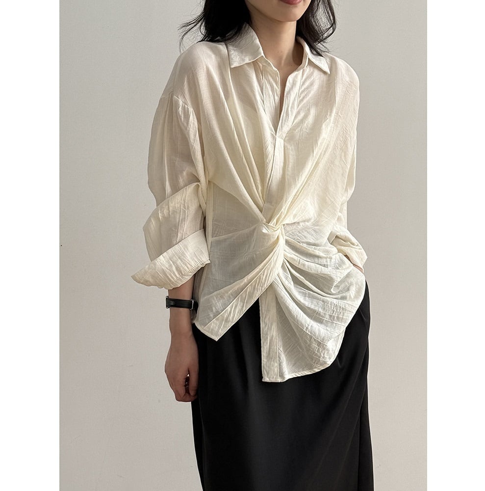くしゅっとしたフロントノットデザインがこなれ感抜群のオーバーサイズシャツ。 シャツのきちんと感を残しつつ、ウエストのノットデザインがさりげないアクセントとなり大人っぽさを演出します。 さまざまな着こなしはもちろん、日焼けや冷房対策にも重宝する、万能アイテムです。 《カラー》 ホワイト/ブラック 《サイズ》 M:肩幅53cm 胸囲108cm 着丈76/66cm 袖丈57cm L:肩幅54cm 胸囲112cm 着丈77/67cm 袖丈58cm ※採寸方法により1~3cmの誤差がある場合がございます。 《素材》 ビスコース82%、ナイロン18% ◇人気のおすすめアイテムをもっと見る https://shop.harmonique.net/categories/5911182 ◇商品を購入する前にこちらの【ご購入前に必ずお読みください】をご確認の上お買い求めください。 https://shop.harmonique.net/blog/2024/06/25/010751 《注意事項》 *harmoniqueではお客様からのご注文を受け、お客様の商品を製作・取り寄せしております。 *基本的にお取り寄せ商品となるため、発送までに《1~3週間前後》お時間をいただいております。 *ご覧いただいているPCやスマートフォンの画面により実物と多少色合いが異なる場合がございます。 *イメージ違いやサイズ違い等、その他お客様都合によりますキャンセル・返品交換はご遠慮ください。 トップページはこちら https://shop.harmonique.net/