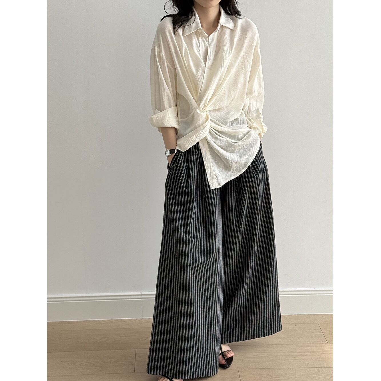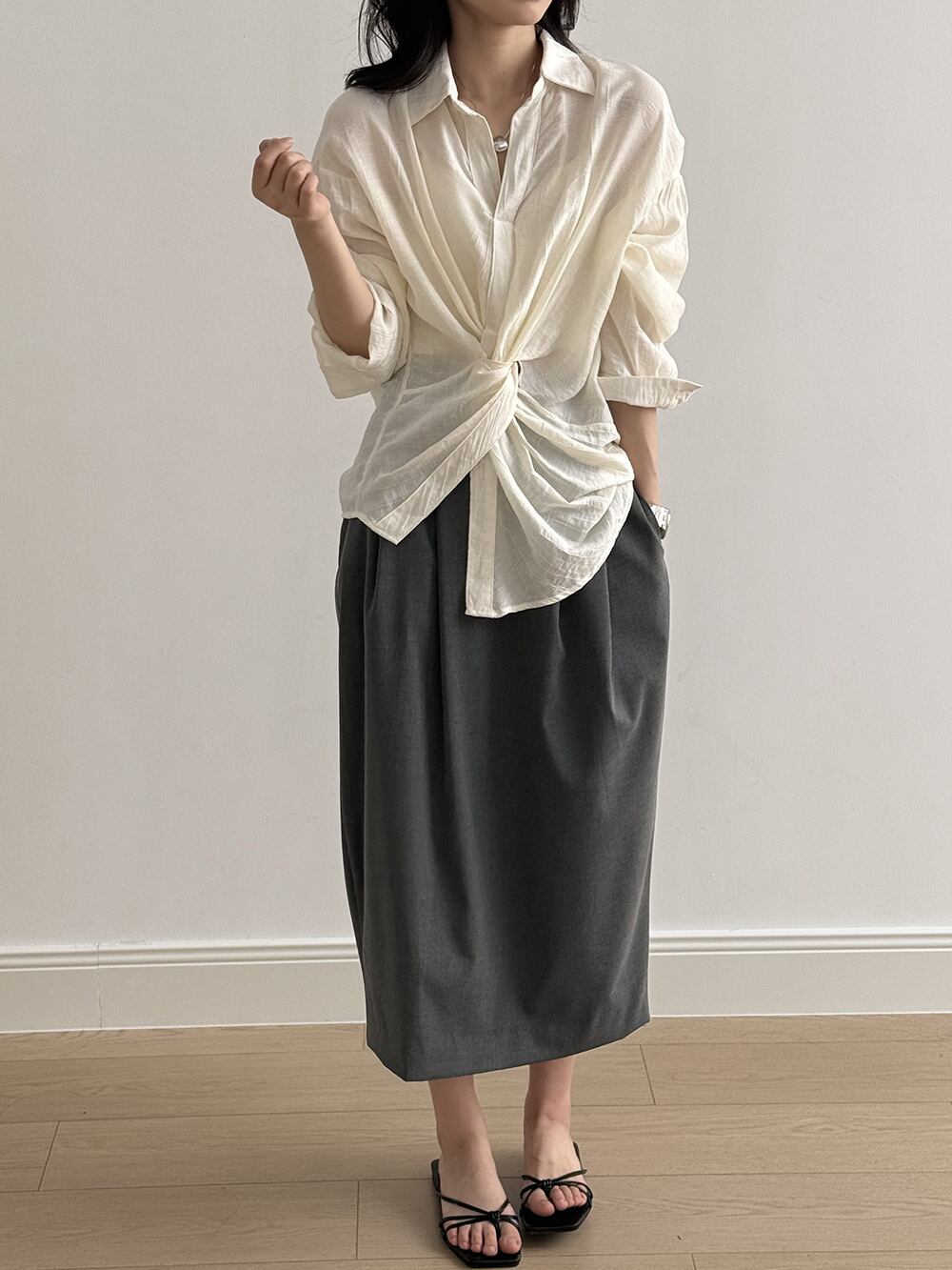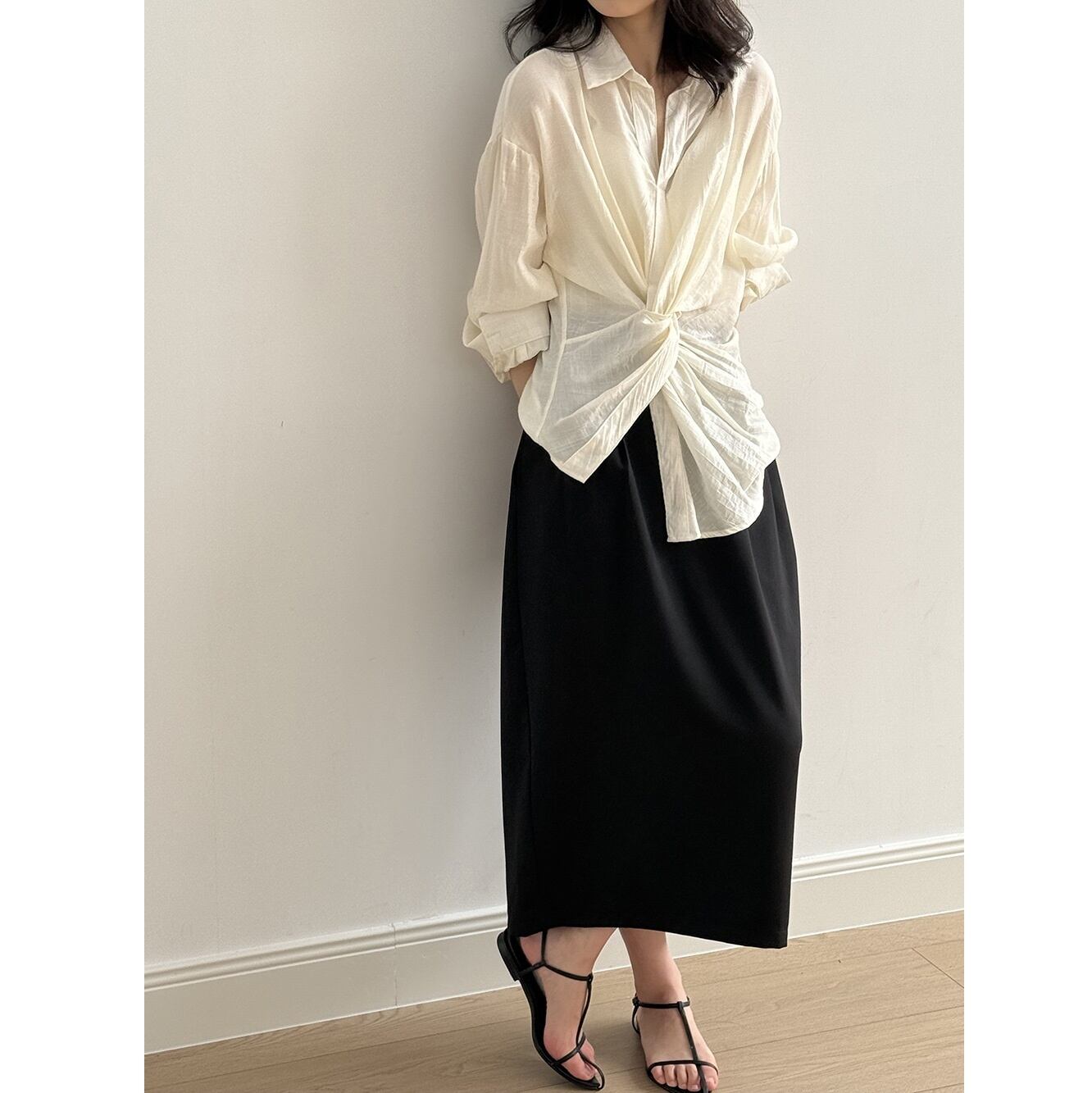 くしゅっとしたフロントノットデザインがこなれ感抜群のオーバーサイズシャツ。 シャツのきちんと感を残しつつ、ウエストのノットデザインがさりげないアクセントとなり大人っぽさを演出します。 さまざまな着こなしはもちろん、日焼けや冷房対策にも重宝する、万能アイテムです。 《カラー》 ホワイト/ブラック 《サイズ》 M:肩幅53cm 胸囲108cm 着丈76/66cm 袖丈57cm L:肩幅54cm 胸囲112cm 着丈77/67cm 袖丈58cm ※採寸方法により1~3cmの誤差がある場合がございます。 《素材》 ビスコース82%、ナイロン18% ◇人気のおすすめアイテムをもっと見る https://shop.harmonique.net/categories/5911182 ◇商品を購入する前にこちらの【ご購入前に必ずお読みください】をご確認の上お買い求めください。 https://shop.harmonique.net/blog/2024/06/25/010751 《注意事項》 *harmoniqueではお客様からのご注文を受け、お客様の商品を製作・取り寄せしております。 *基本的にお取り寄せ商品となるため、発送までに《1~3週間前後》お時間をいただいております。 *ご覧いただいているPCやスマートフォンの画面により実物と多少色合いが異なる場合がございます。 *イメージ違いやサイズ違い等、その他お客様都合によりますキャンセル・返品交換はご遠慮ください。 トップページはこちら https://shop.harmonique.net/