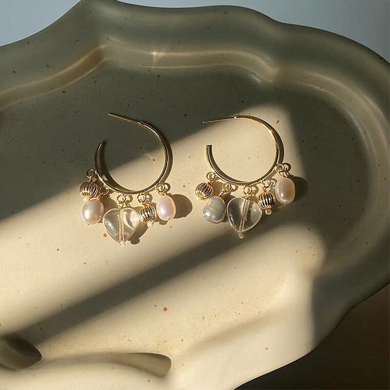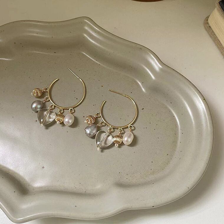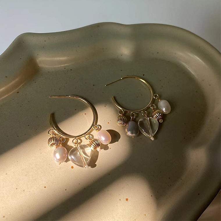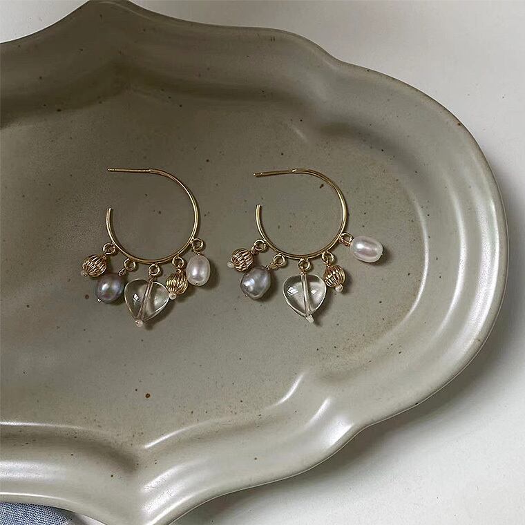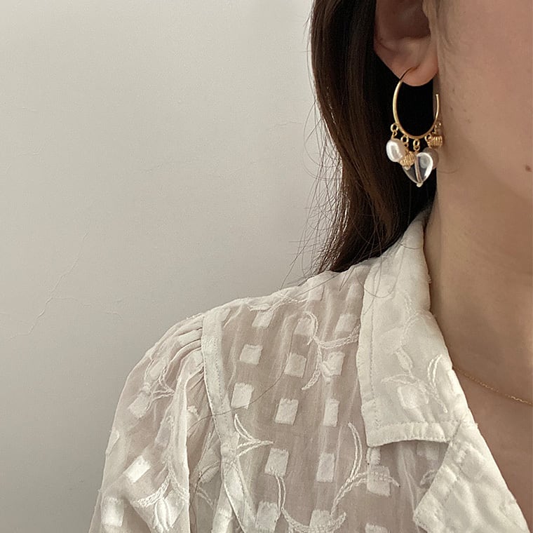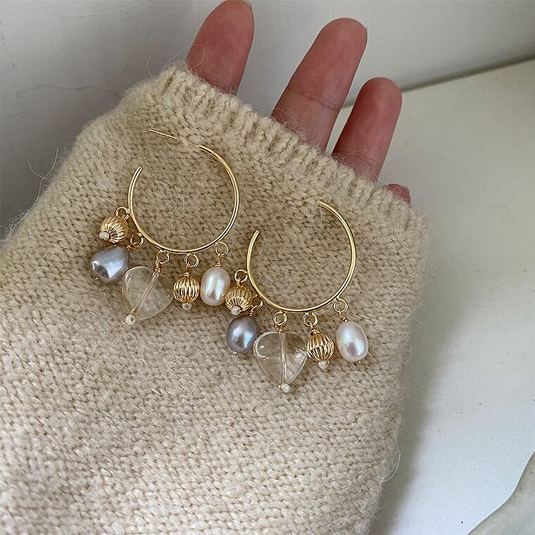 ゴールドのフープピアスに、淡水パールとクリアビーズが揺れる、上品で華やかなデザインのピアス。