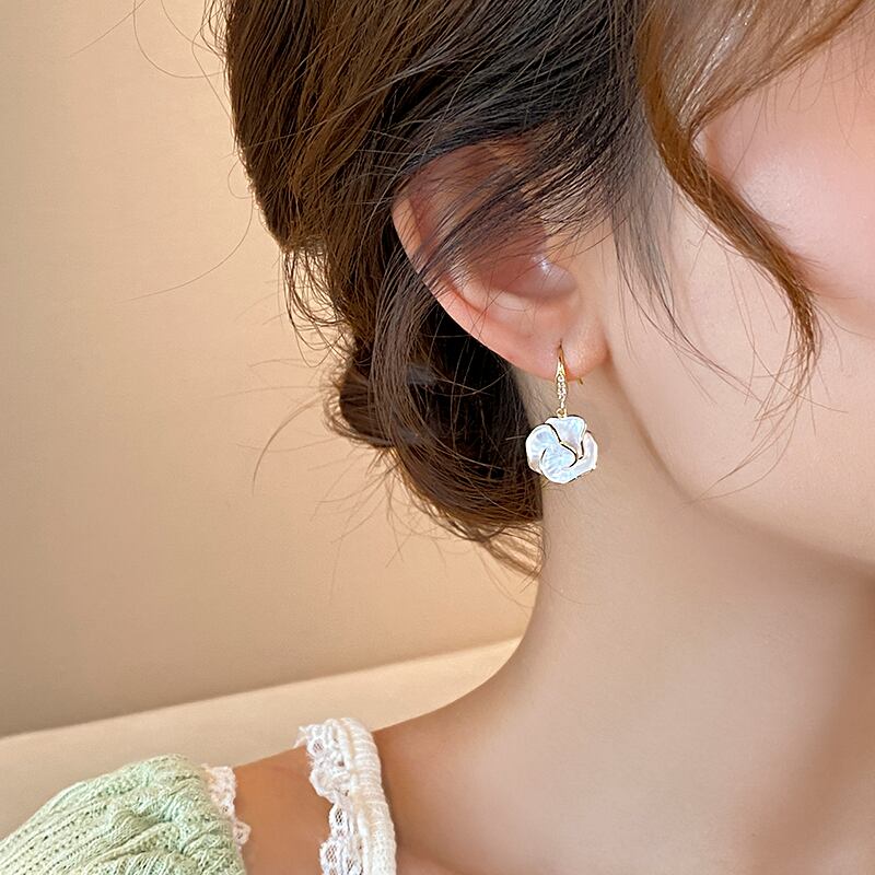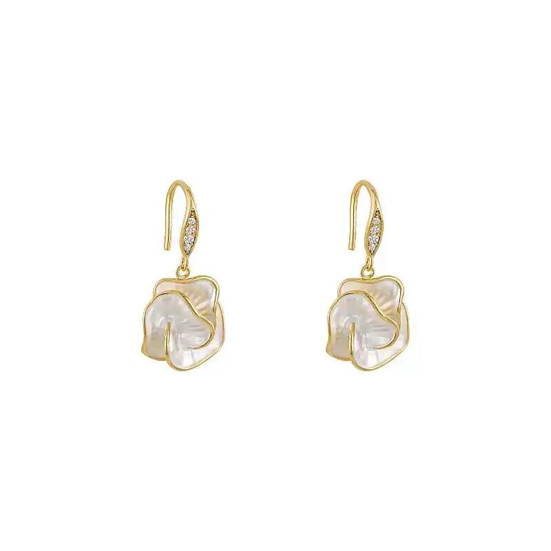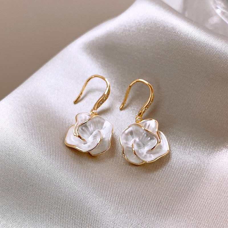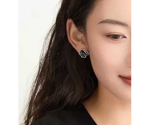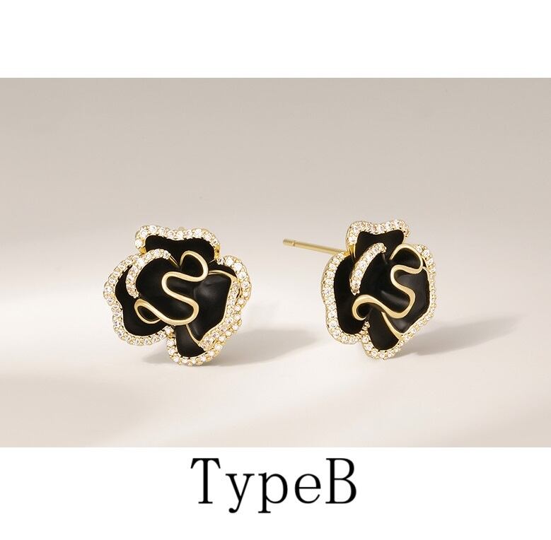 カメリアの花モチーフが繊細に表現されたホワイトとブラックの2種のピアス。