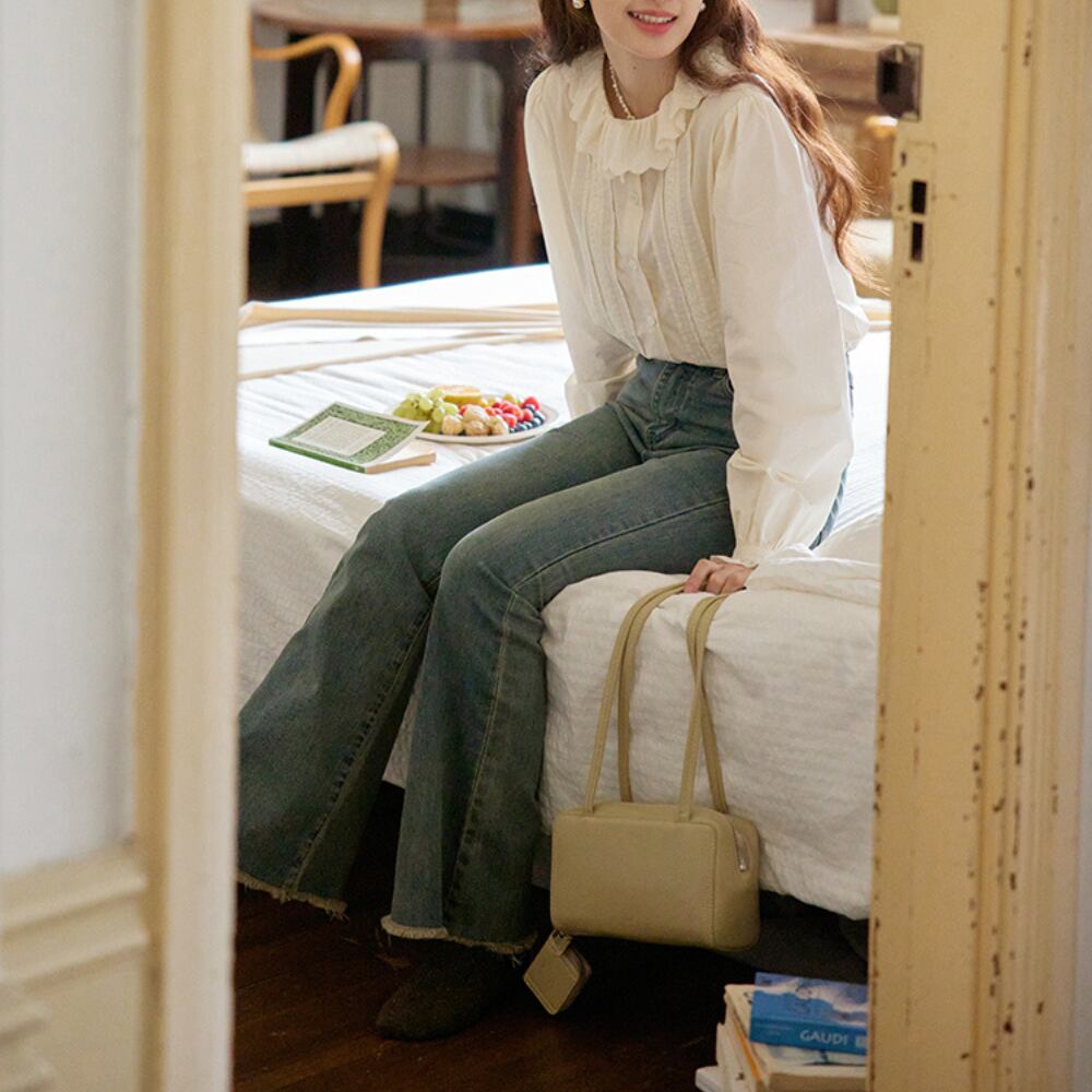 上品で女性らしい印象のフリルカラー長袖ブラウス。