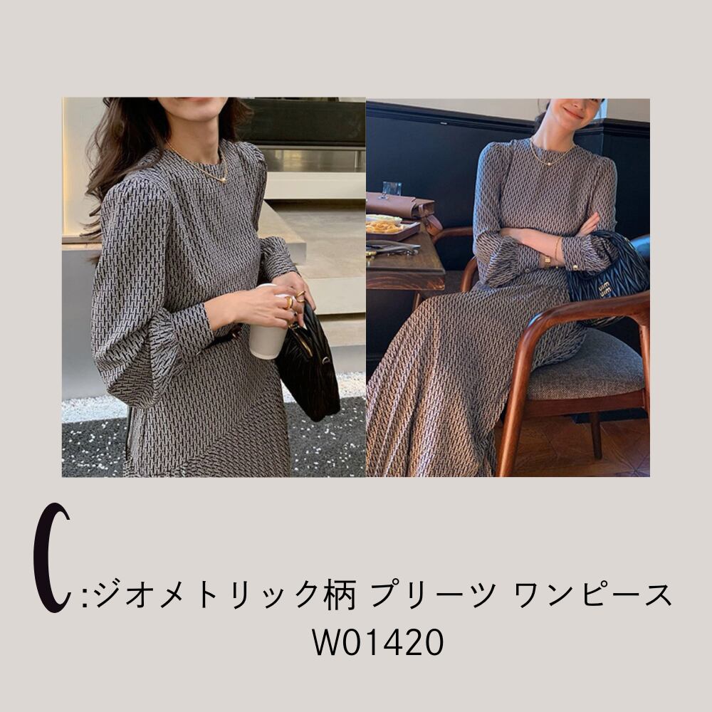 C:ジオメトリック柄 プリーツ ワンピース W01420