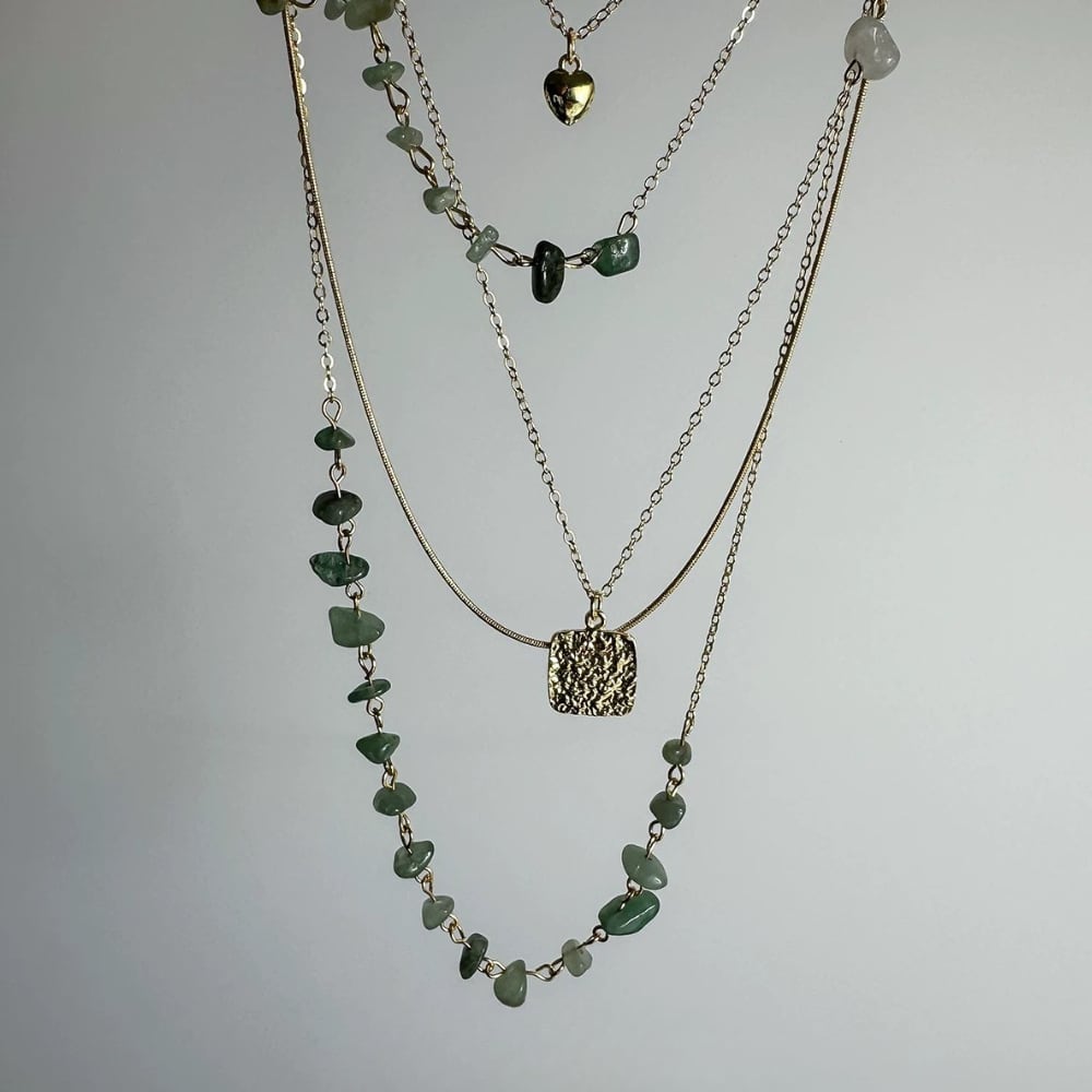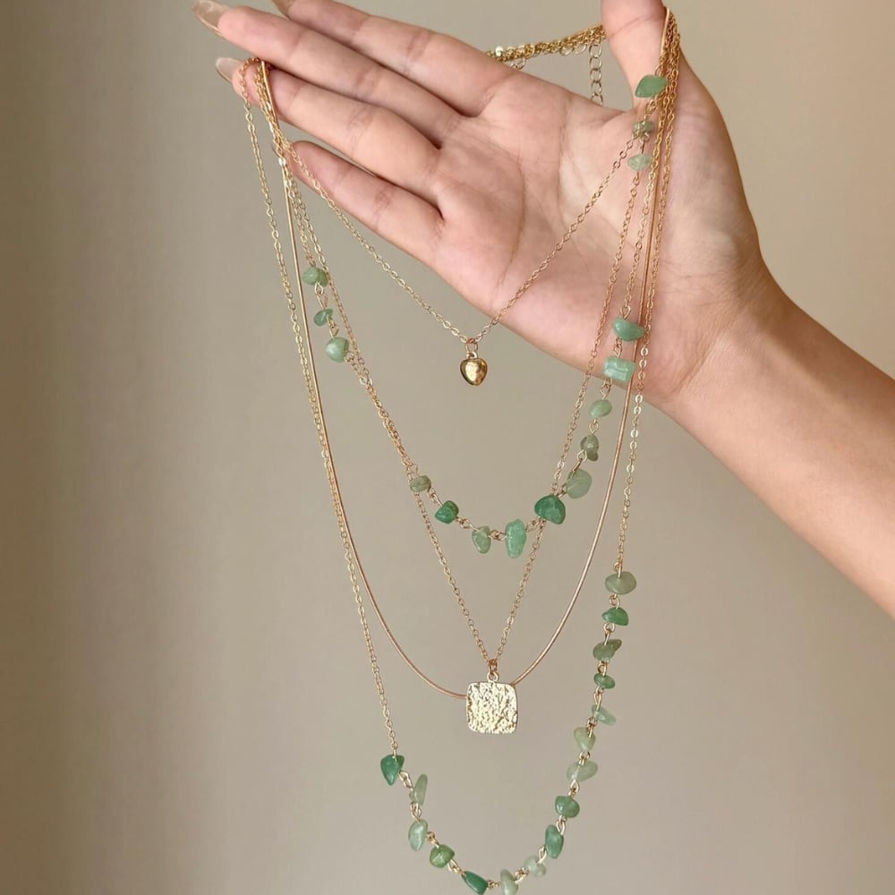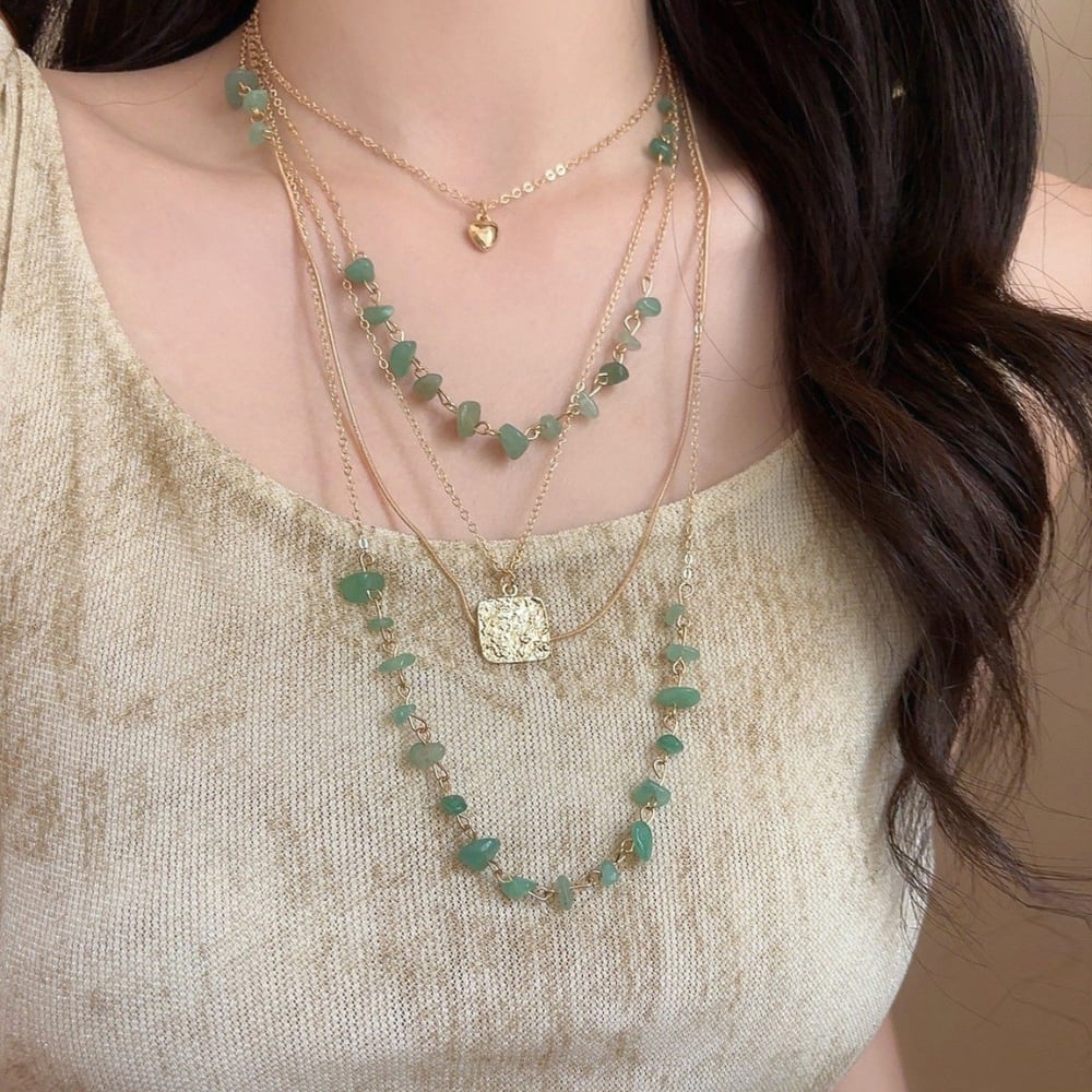 異なるデザインのチェーンが重なり、胸元に奥行きを演出するネックレス。