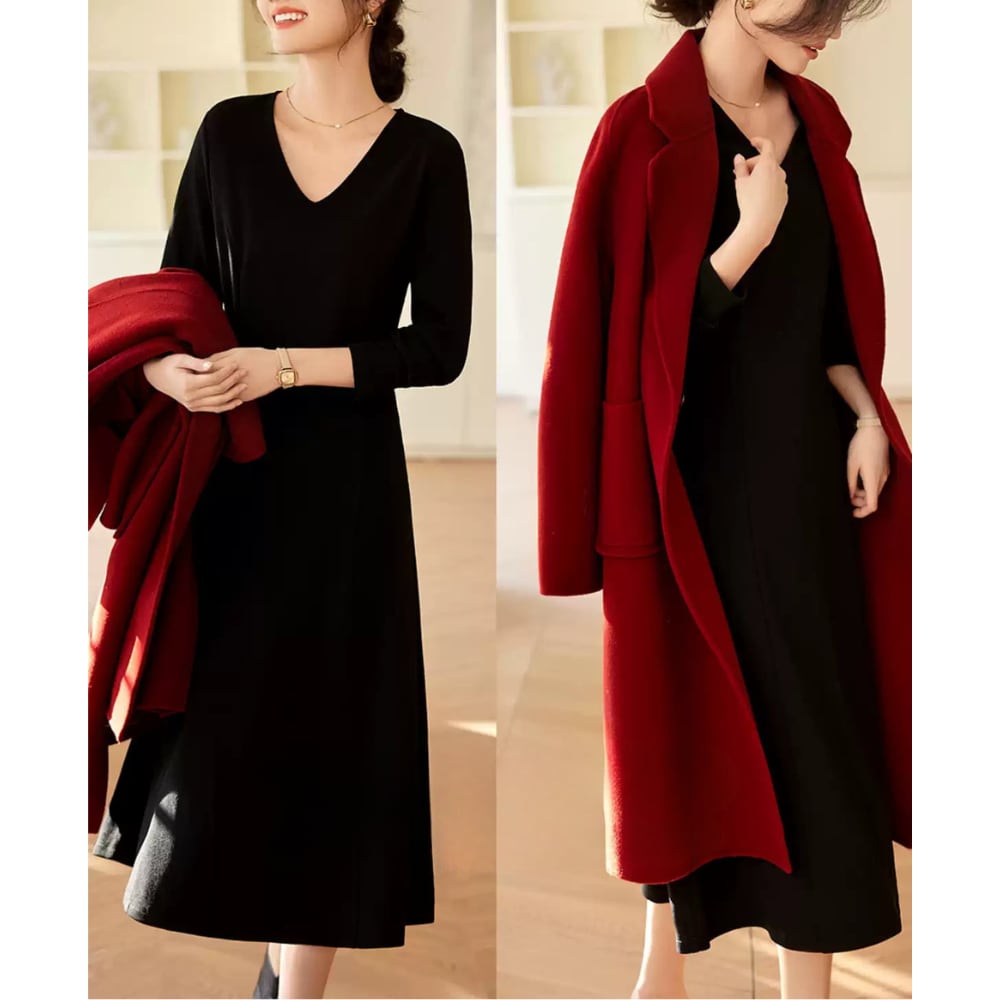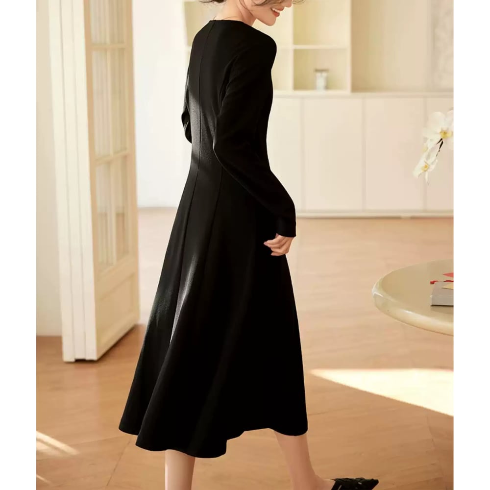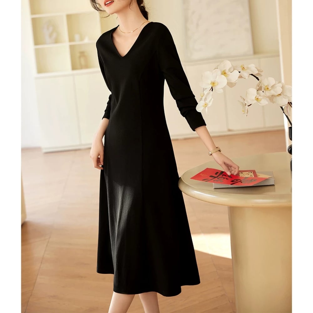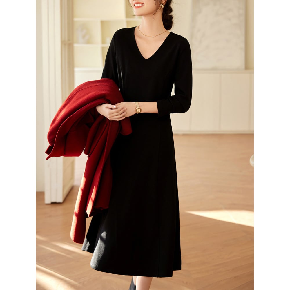 シンプルなVネックがデコルテを美しく見せる長袖ワンピース。