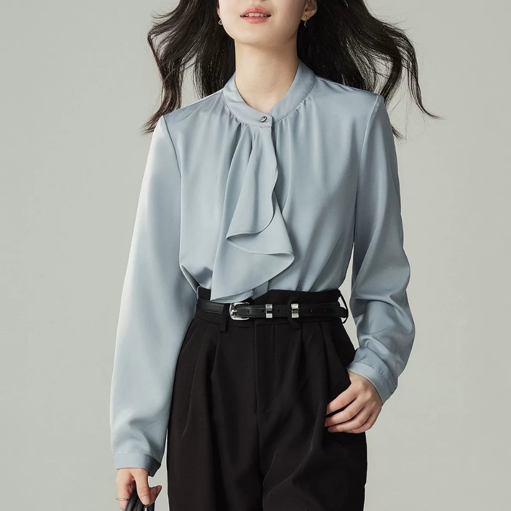 優しい色調が魅力で、オフィスからデイリーまで活躍する長袖ブラウス。