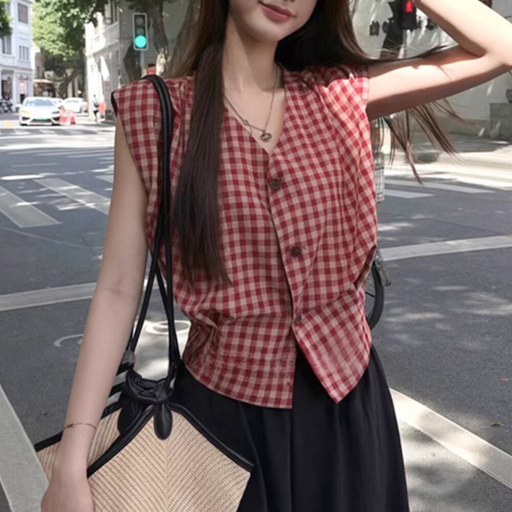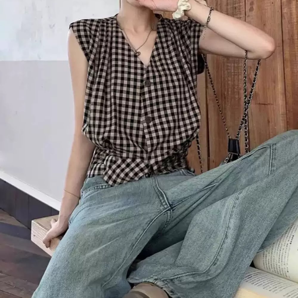 ボタンフロント チェック柄 半袖シャツ 2color W01464