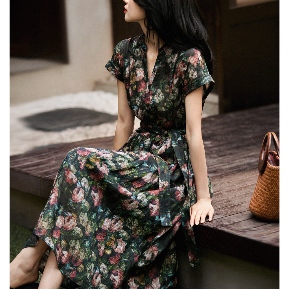 シックなクラシックアート柄が、ラグジュアリーで静謐な魅力を醸し出すシャツワンピース。