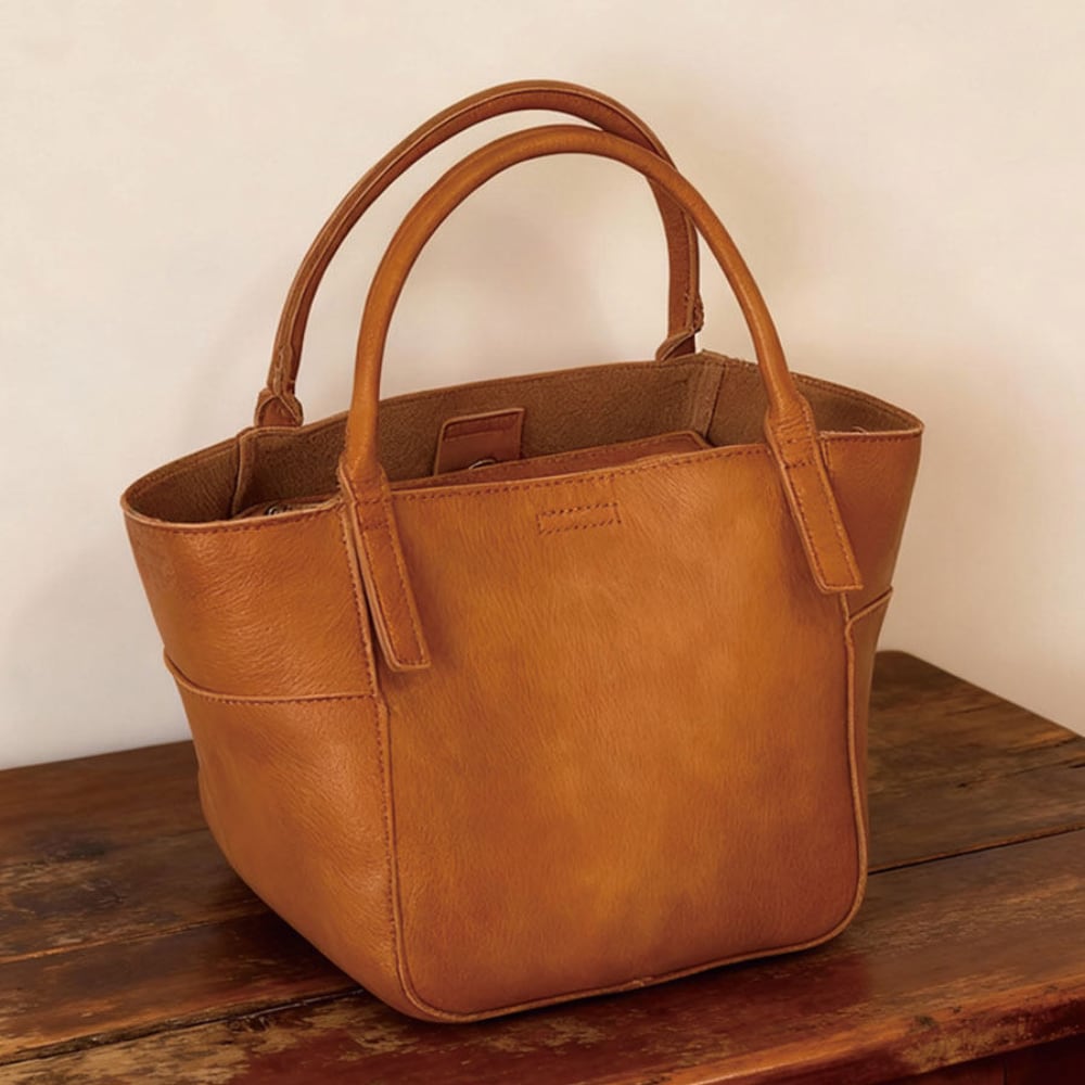 シックなブラウンがクラシックな印象を与える、スクエア型の革製トートバッグ。
