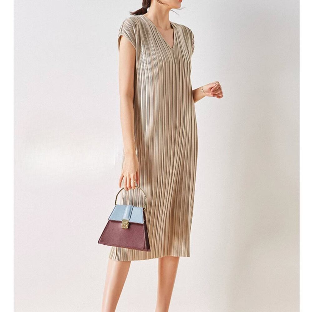 顔周りをすっきりと見せるVネックと、上品なプリーツディテールが魅力のワンピース。