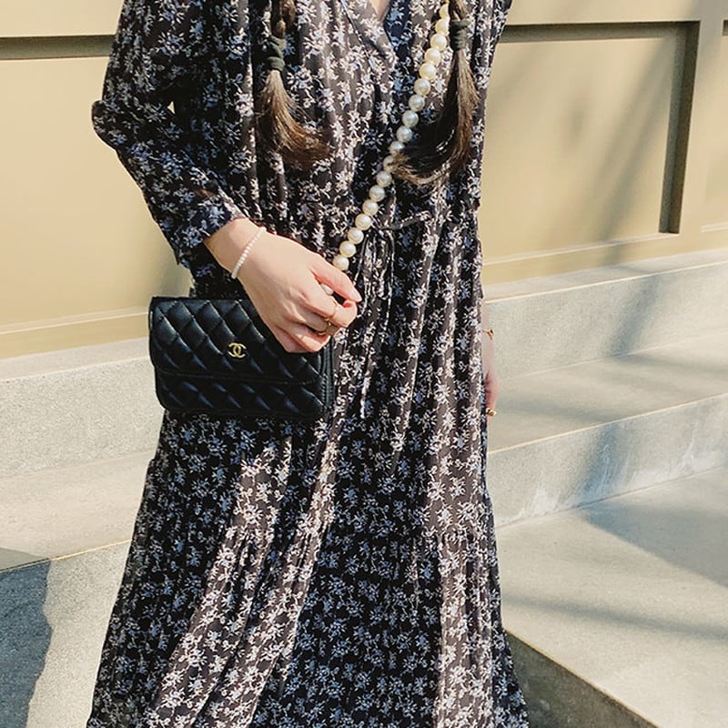 ロマンチックな雰囲気漂うVネック花柄シフォンワンピース。