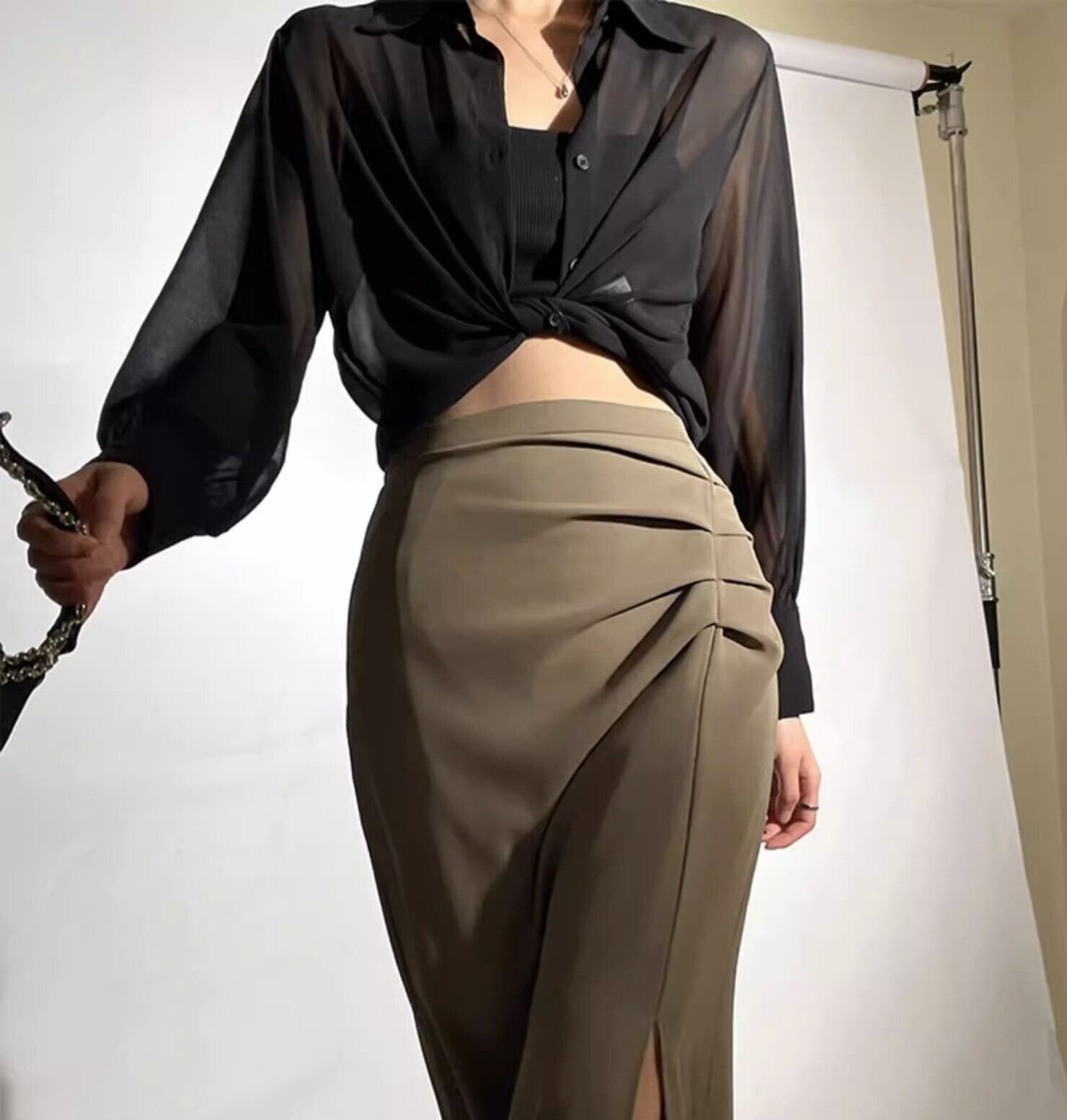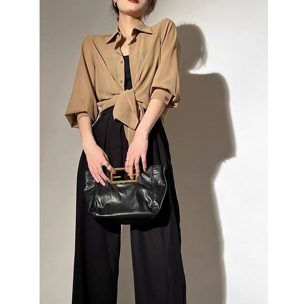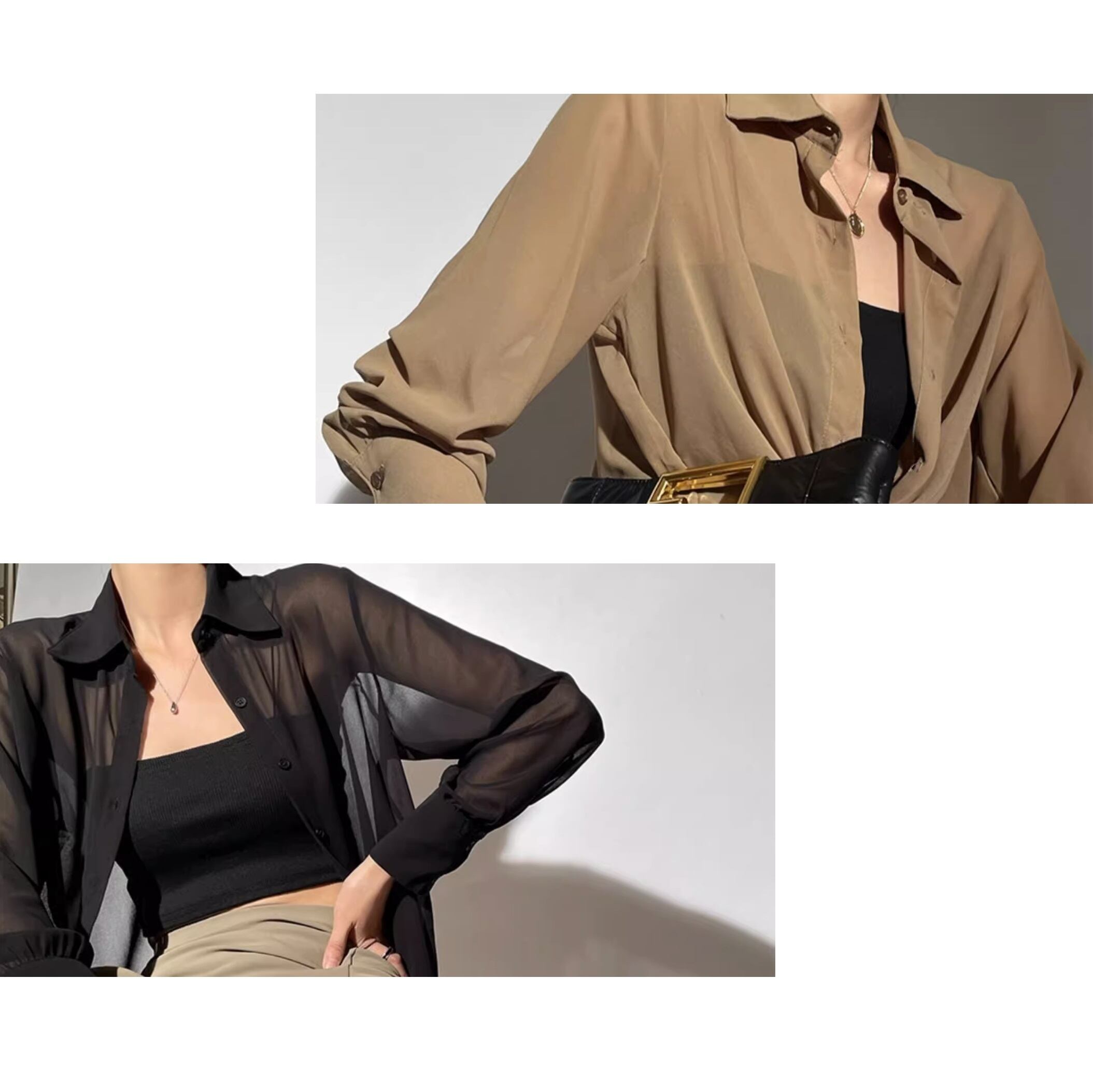 シアー素材のロングスリーブシャツは、一枚で洗練されたスタイリングを叶えてくれます。 スタンダードなデザインが上品で落ち着いた印象を与え、裾を結んだり等アレンジも自在。 オフィスシーンではきちんと感を演出、休日のカジュアルスタイルにはこなれ感をプラス。一枚持っていると便利な、頼れるアイテムです。 《カラー》 ブラック/ブラウン 《サイズ》 XS : 胸囲102cm 着丈68cm 袖丈55cm S : 胸囲104cm 着丈69cm 袖丈56cm M : 胸囲106cm 着丈70cm 袖丈57cm L : 胸囲108cm 着丈71cm 袖丈58cm XL : 胸囲110cm 着丈72cm 袖丈59cm ※採寸方法により1~3cmの誤差がある場合がございます。 《素材》 ポリエステル ◇人気のおすすめアイテムをもっと見る https://shop.harmonique.net/categories/5911182 ◇商品を購入する前にこちらの【ご購入前に必ずお読みください】をご確認の上お買い求めください。 https://shop.harmonique.net/blog/2024/06/25/010751 《注意事項》 *harmoniqueではお客様からのご注文を受け、お客様の商品を製作・取り寄せしております。 *基本的にお取り寄せ商品となるため、発送までに《1~3週間前後》お時間をいただいております。 *ご覧いただいているPCやスマートフォンの画面により実物と多少色合いが異なる場合がございます。 *イメージ違いやサイズ違い等、その他お客様都合によりますキャンセル・返品交換はご遠慮ください。 トップページはこちら https://shop.harmonique.net/