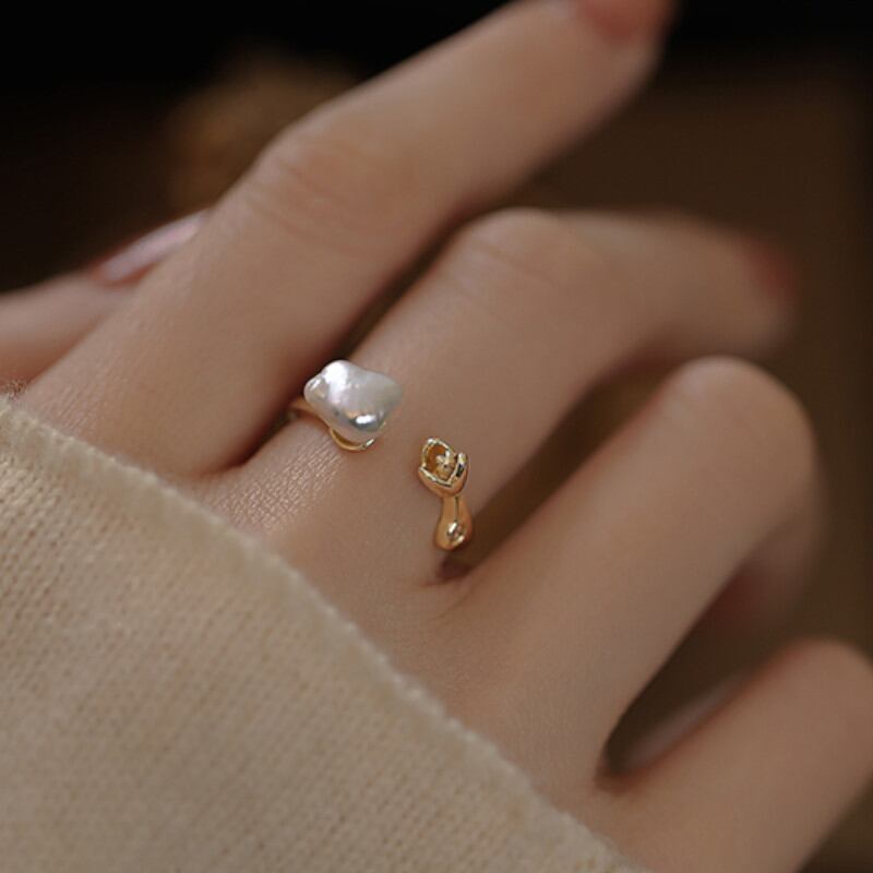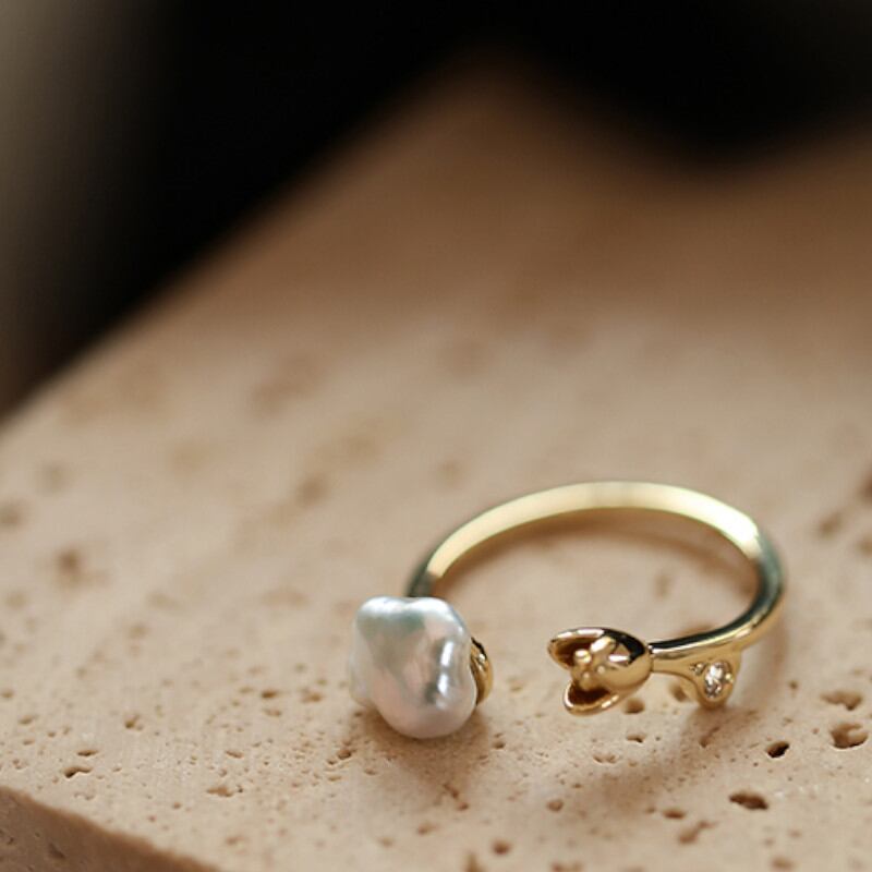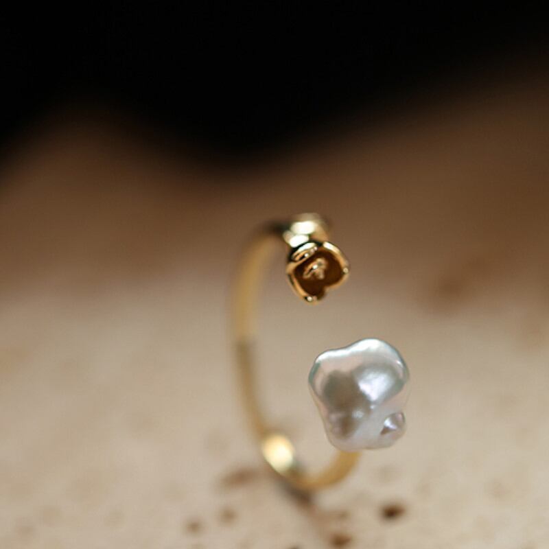 バロックパールの個性的な形状がアクセントとなり、指元を華やかに演出します。
