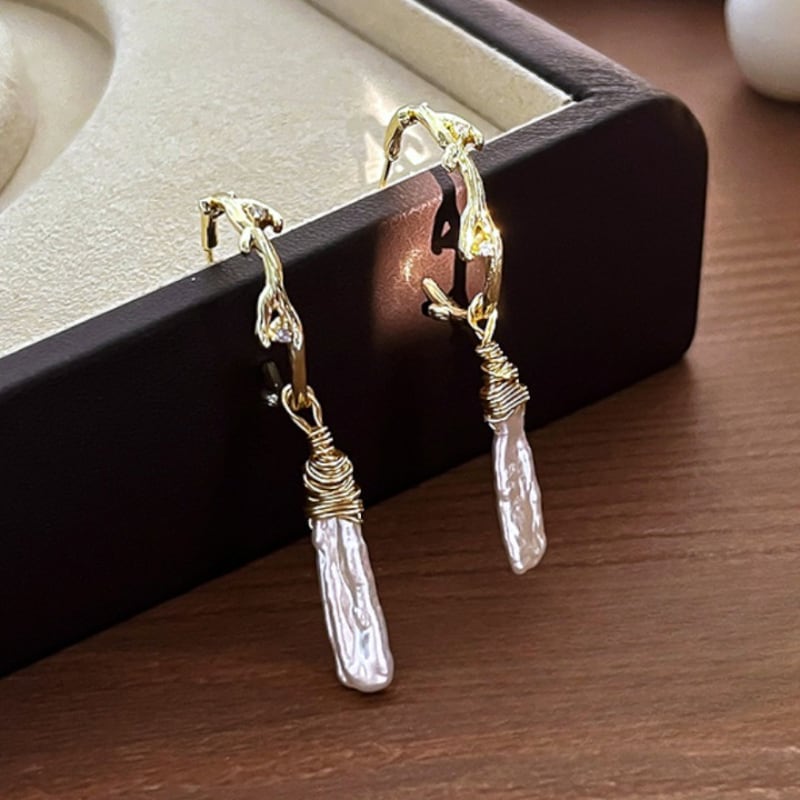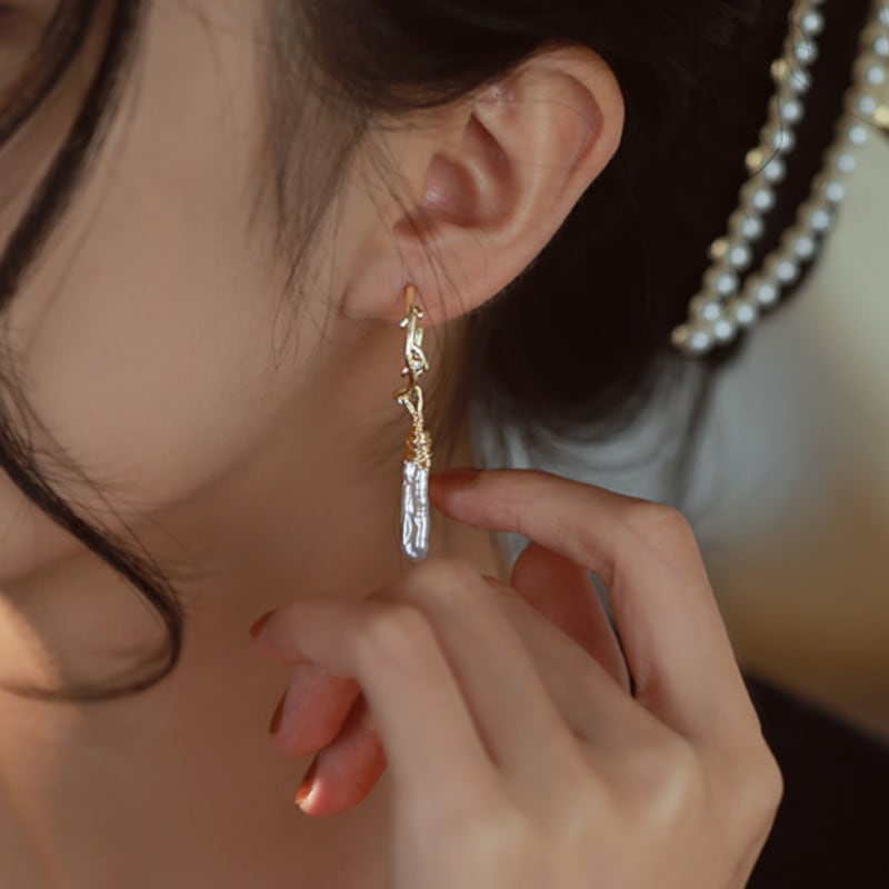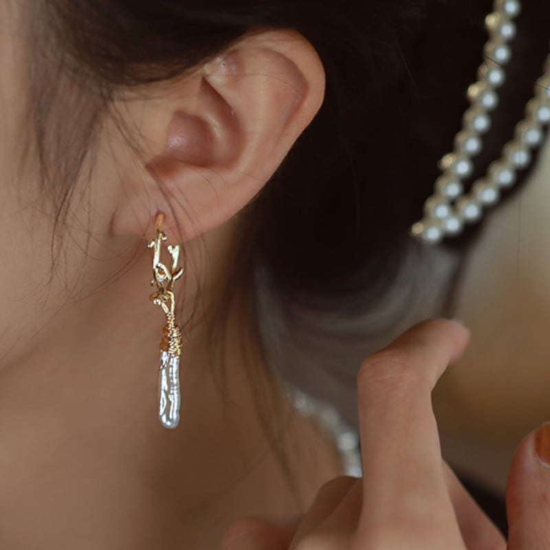 エレガントで上品なデザインが特徴のバロックパールゴールドピアス。
