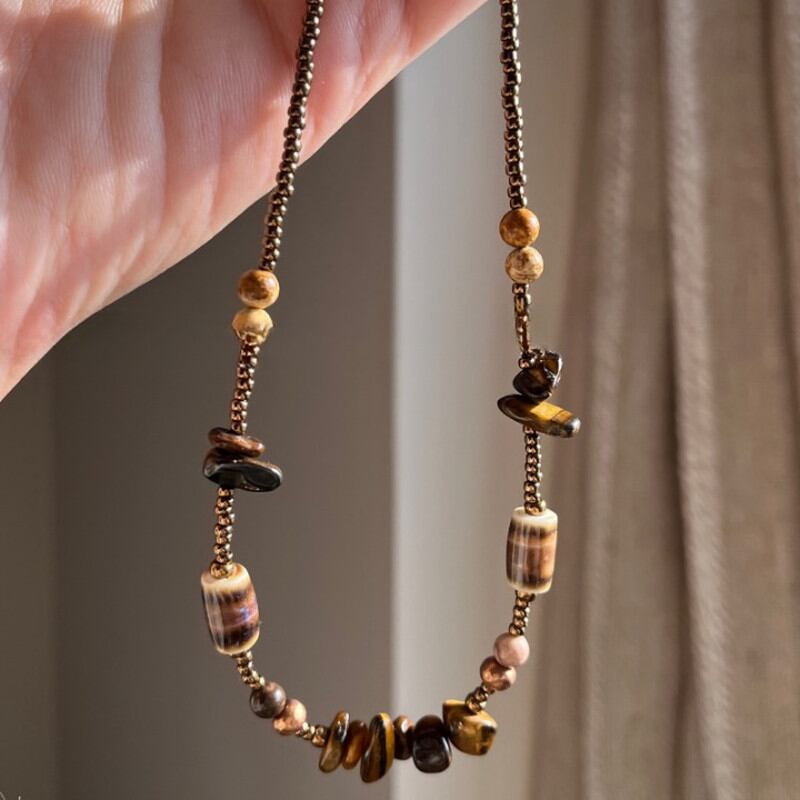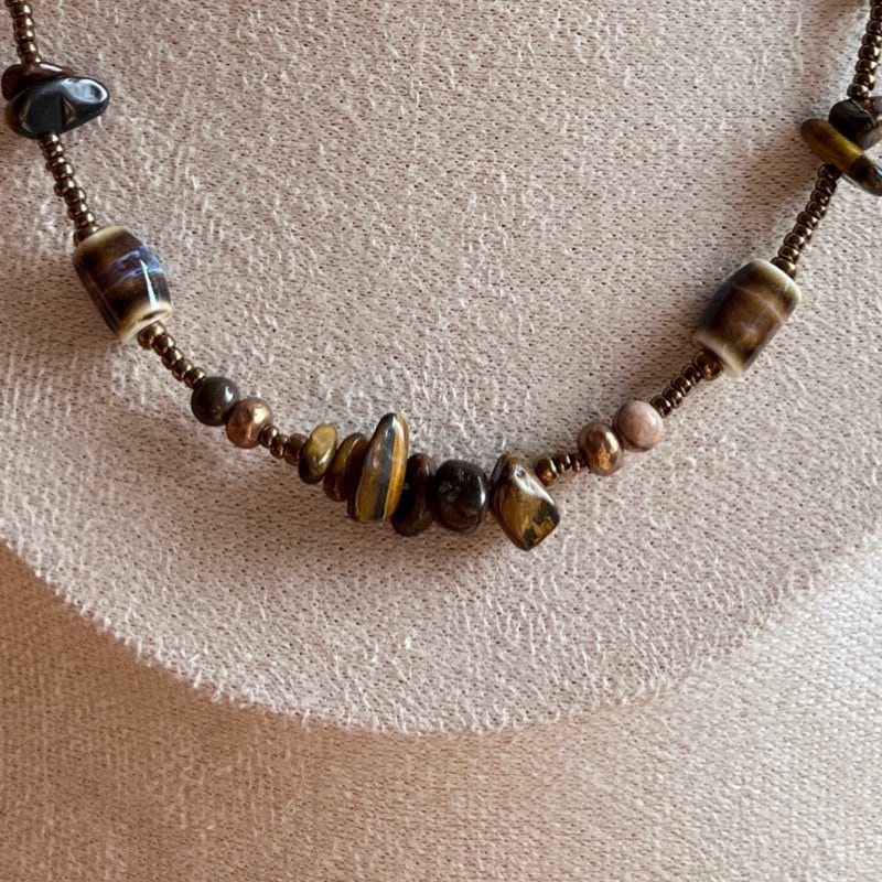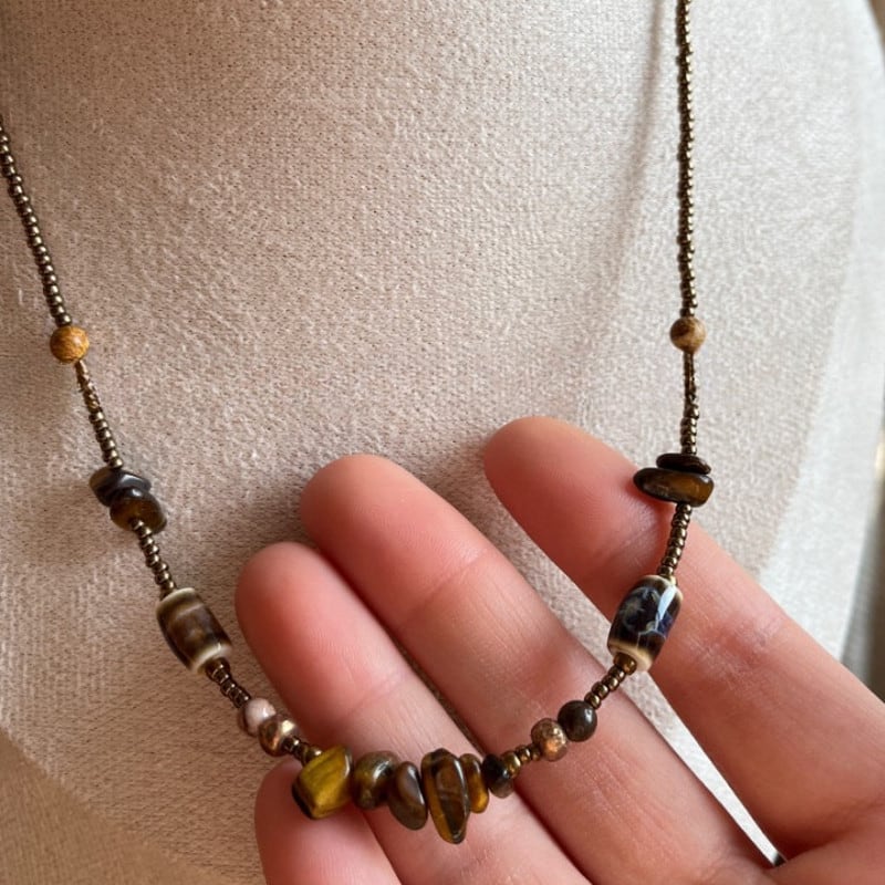 天然石のヴィンテージビーズネックレスは、それぞれの石の持つ艶やかな色味と模様が、洗練された装いに華やかさを添えます。
