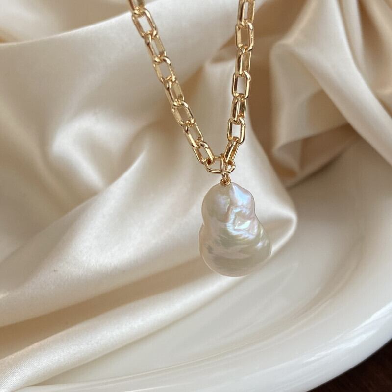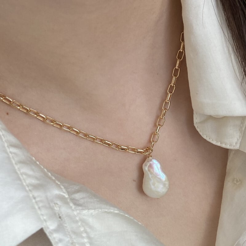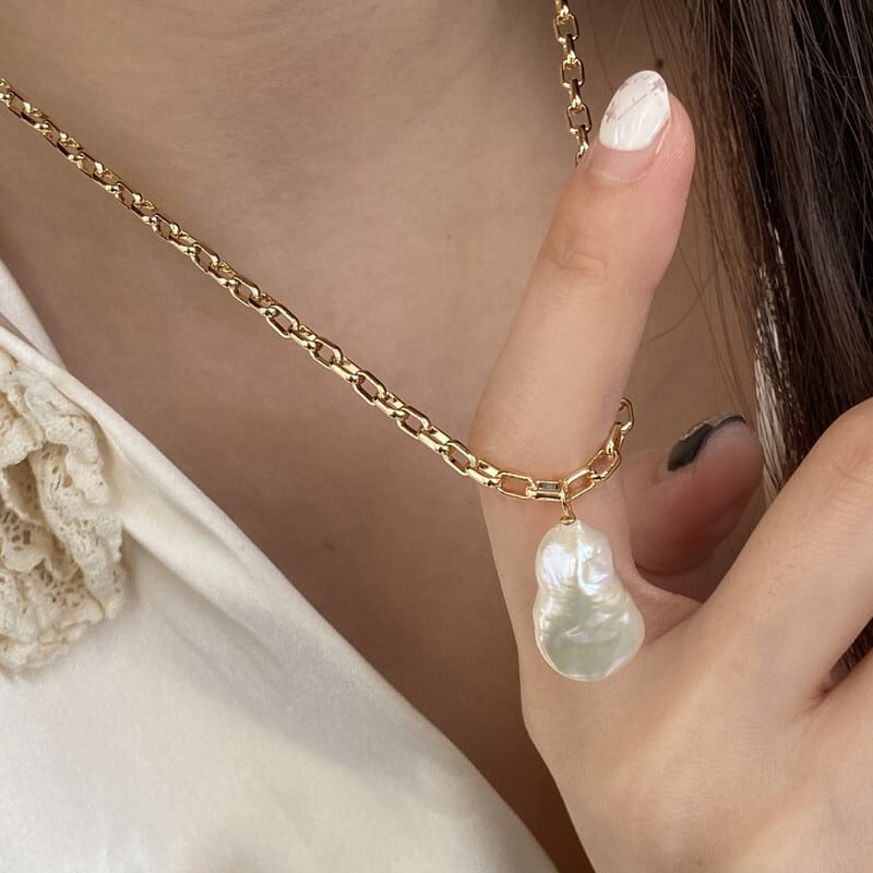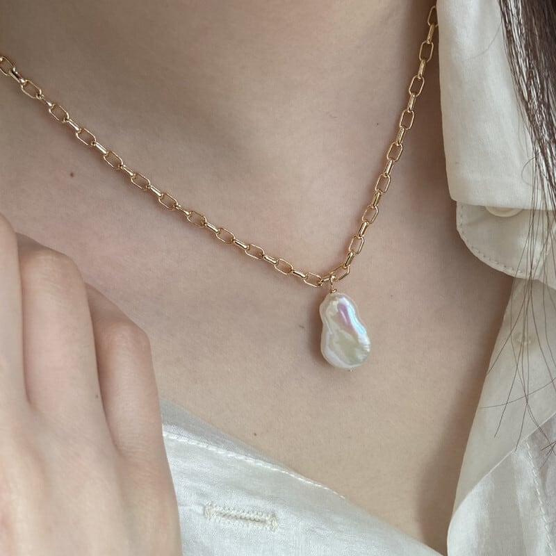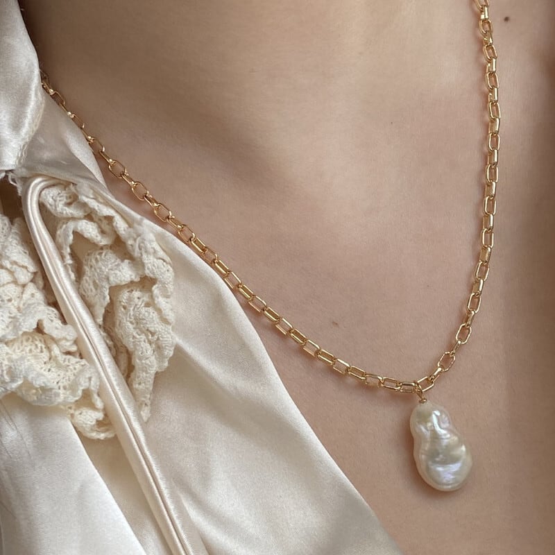 上品な輝きを放つバロックパールが、ゴールドチェーンと組み合わさり、どんなシーンにも映えます。