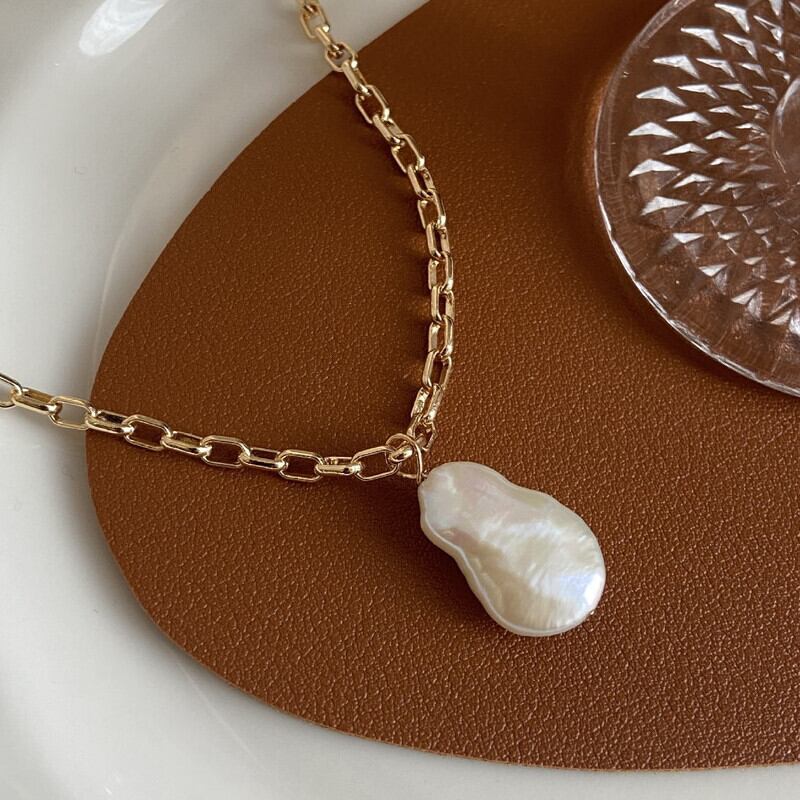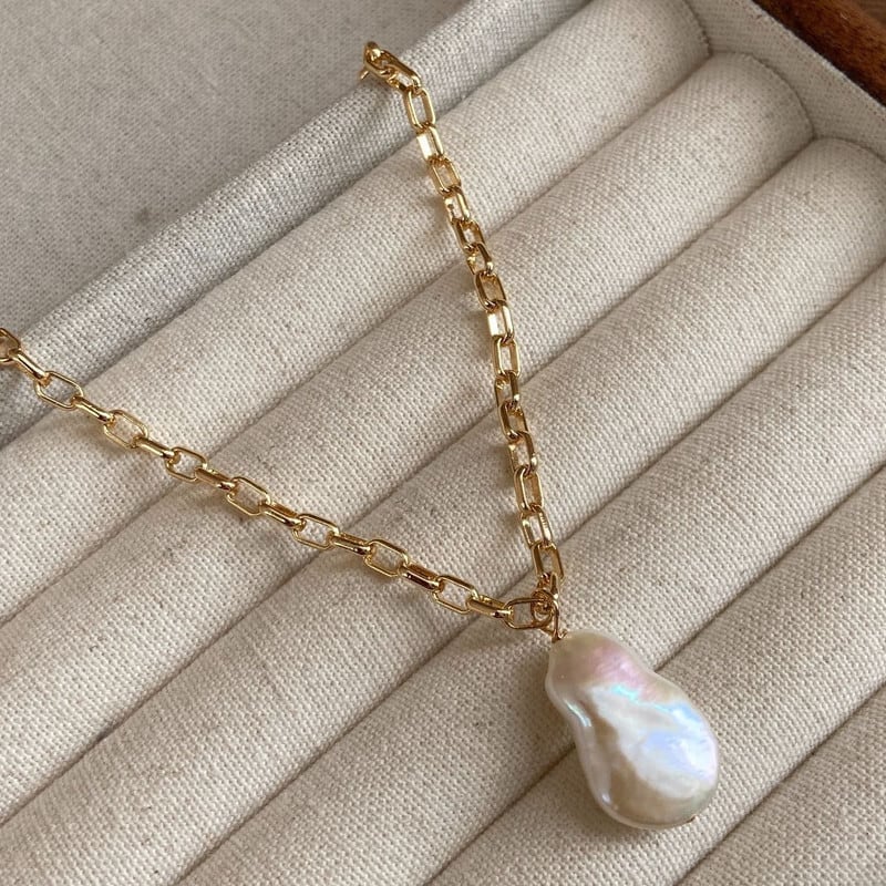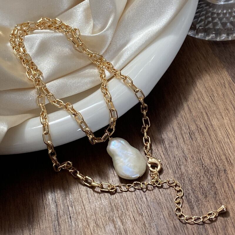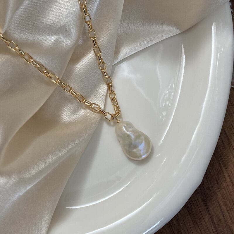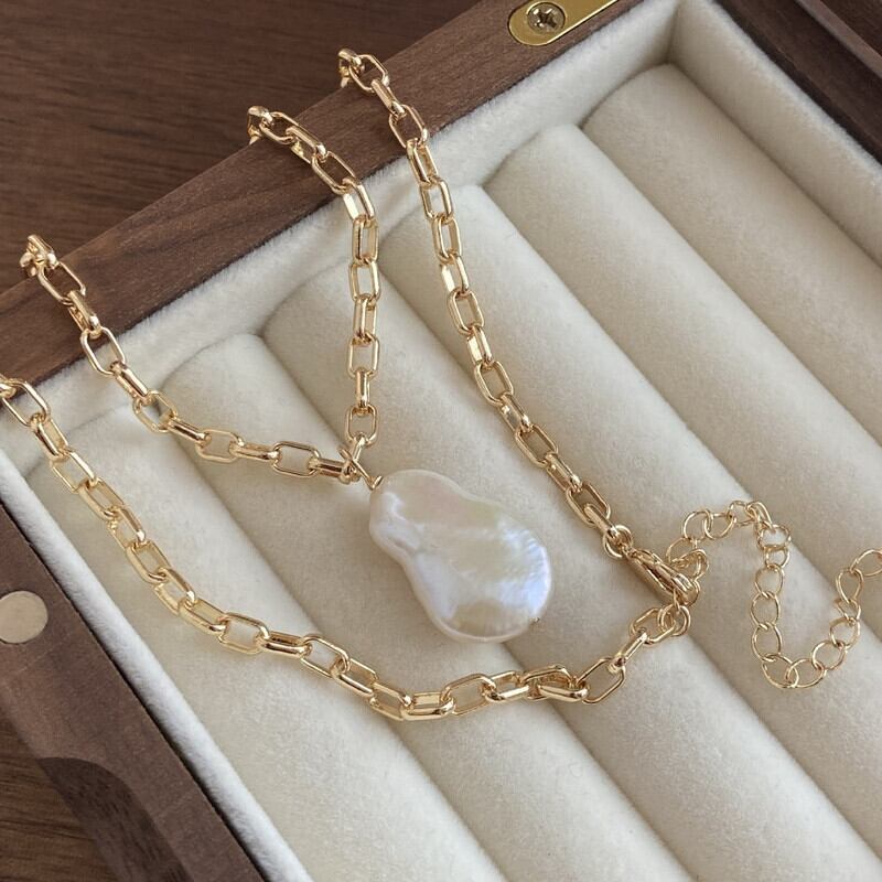 上品な輝きを放つバロックパールが、ゴールドチェーンと組み合わさり、どんなシーンにも映えます。