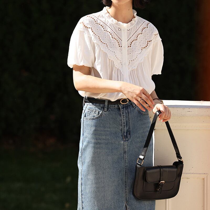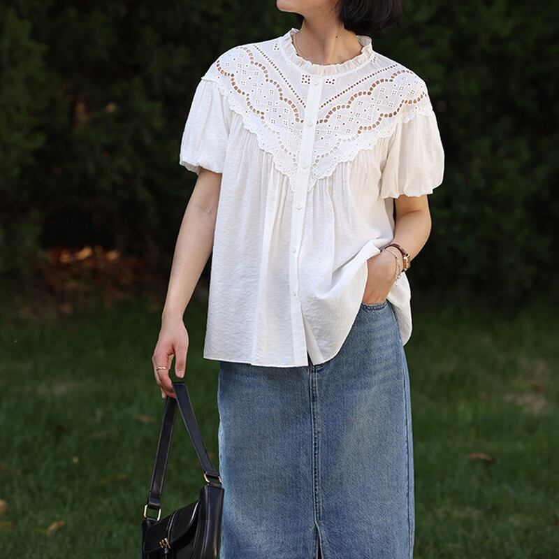 ロマンティックな雰囲気漂うレースブラウス。 袖口が広がったデザインは、女性らしさを引き立てます。 シースルーな素材が華やかさを演出し、どんなコーディネートにも合わせやすいのが魅力です。 《カラー》 ホワイト/エクリュ 《サイズ》 XS:肩幅51.5cm 胸囲104cm 着丈60.5cm 袖丈17cm S:肩幅52.5cm 胸囲108cm 着丈61.5cm 袖丈17.5cm M:肩幅53.5cm 胸囲112cm 着丈62.5cm 袖丈18cm L:肩幅54.5cm 胸囲116cm 着丈63.5cm 袖丈18.5cm ※採寸方法により多少の誤差がある場合がございます ※モデル 身長172cm Sサイズ着用 《素材》 ポリエステル/ビスコース/ナイロン/綿 ◇人気のおすすめアイテムをもっと見る https://shop.harmonique.net/categories/5911182 ◇商品を購入する前にこちらの【ご購入前に必ずお読みください】をご確認の上お買い求めください。 https://shop.harmonique.net/blog/2024/06/25/010751 《注意事項》 *harmoniqueではお客様からのご注文を受け、お客様の商品を製作・取り寄せております。 *基本的にお取り寄せ商品となるため、発送までに《1~3週間前後》お時間をいただいております。 *ご覧いただいているPCやスマートフォンの画面により実物と多少色合いが異なる場合がございます。 *イメージ違いやサイズ違い等、その他お客様都合によりますキャンセル・返品交換はご遠慮ください。 トップページはこちら https://shop.harmonique.net/