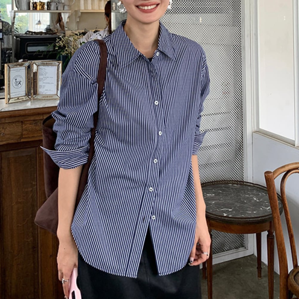 ゆったりとしたシルエットが魅力のヒップ丈長袖シャツ。