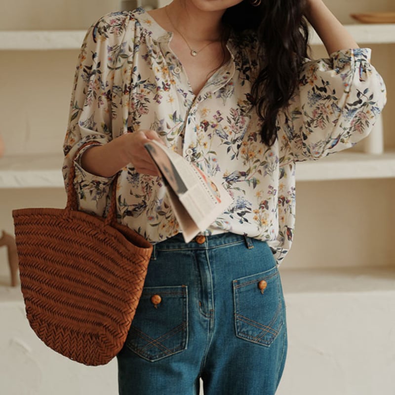 可憐な花柄が描かれたルーズブラウス。