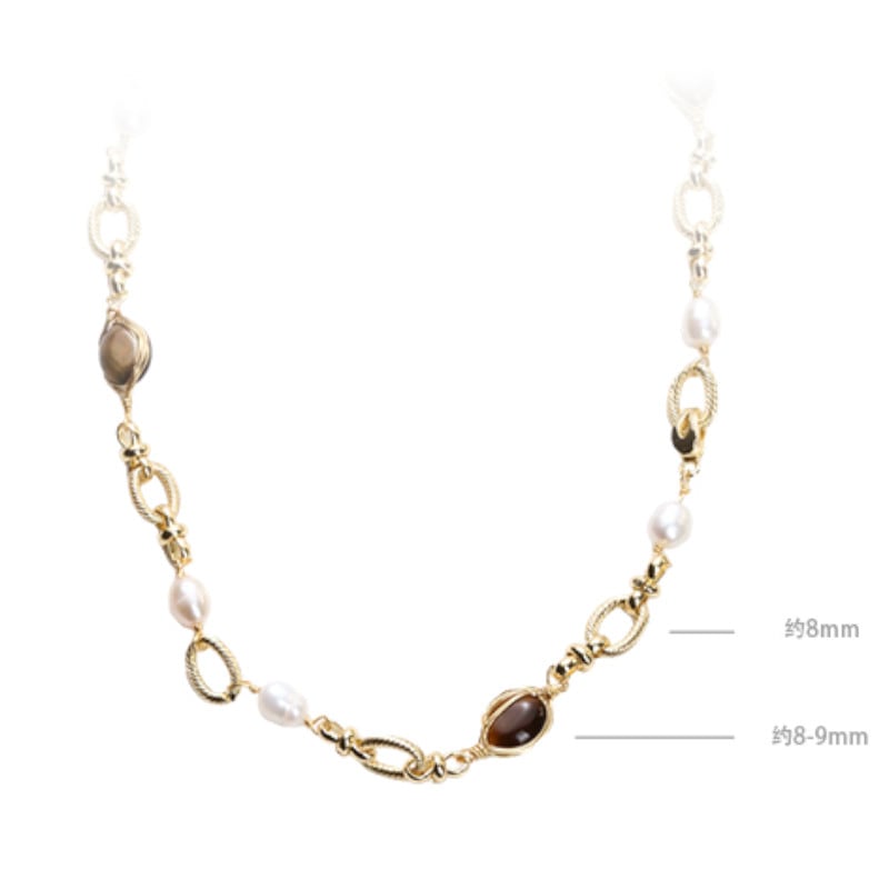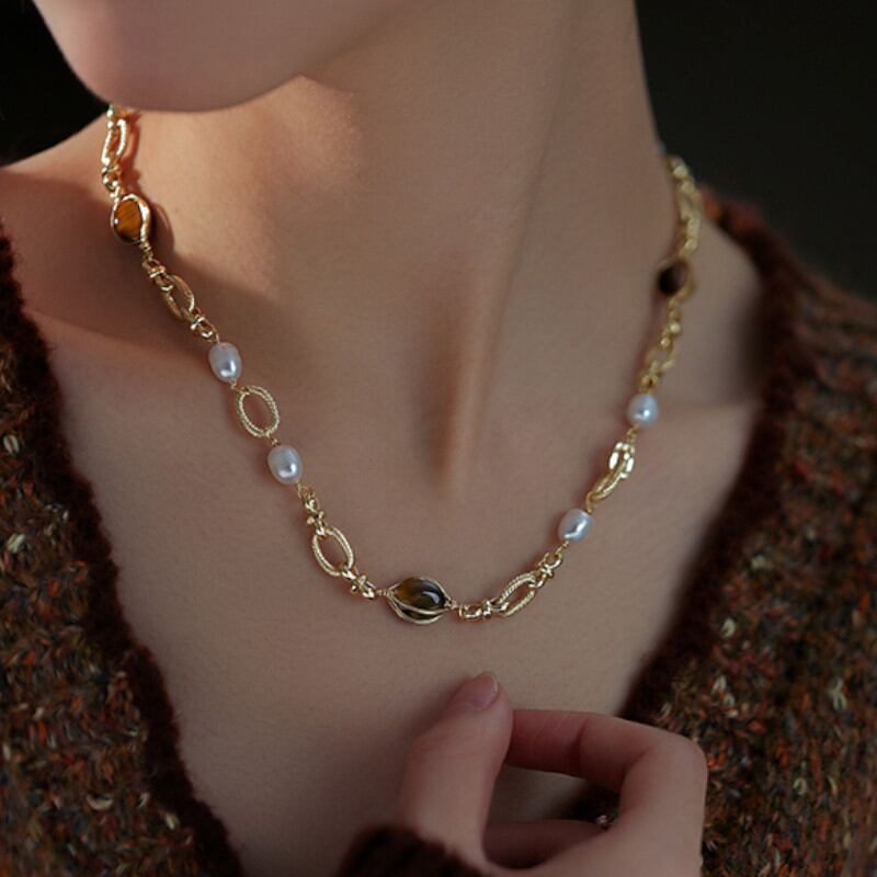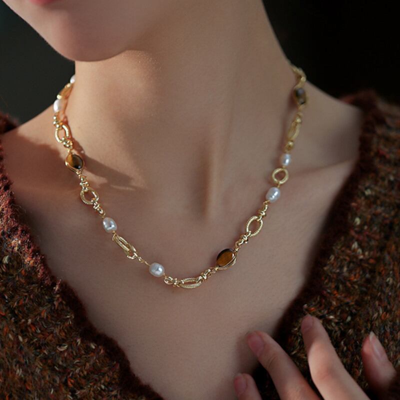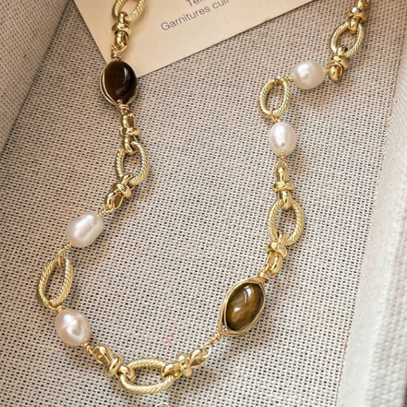 ゴールドチェーンが輝くタイガーアイ&パールネックレス。