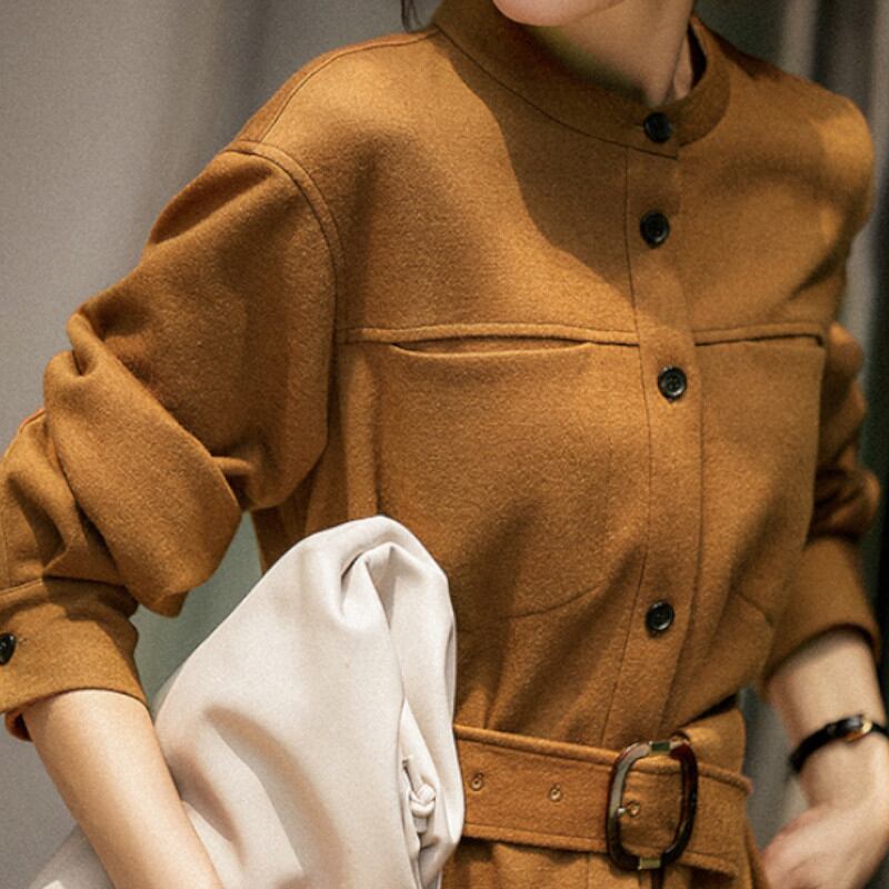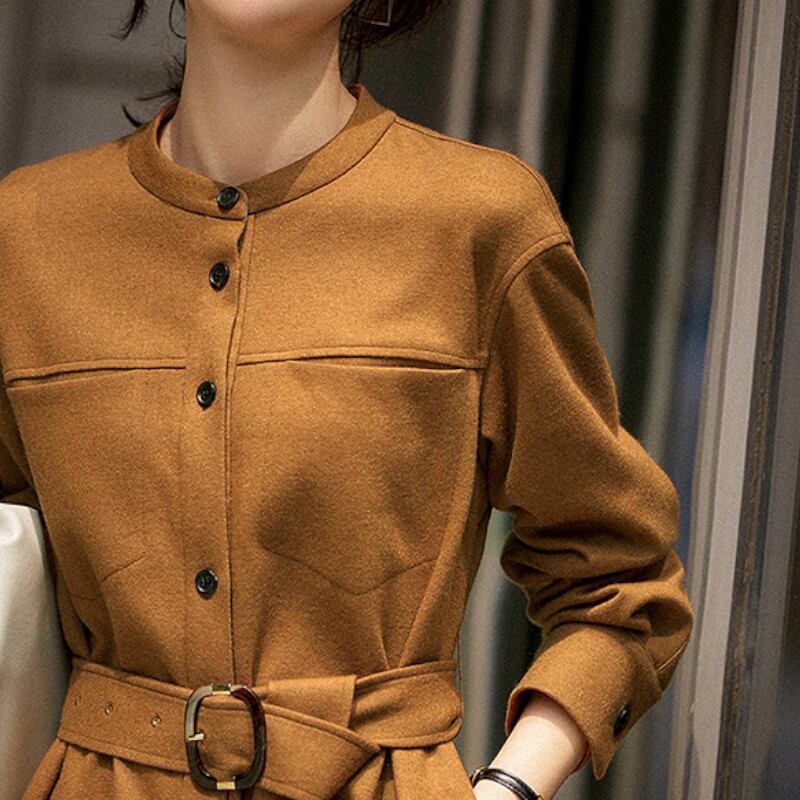 襟元がすっきりとしたラウンドネックで、シングルブレストのデザインがモダンでスタイリッシュ。
