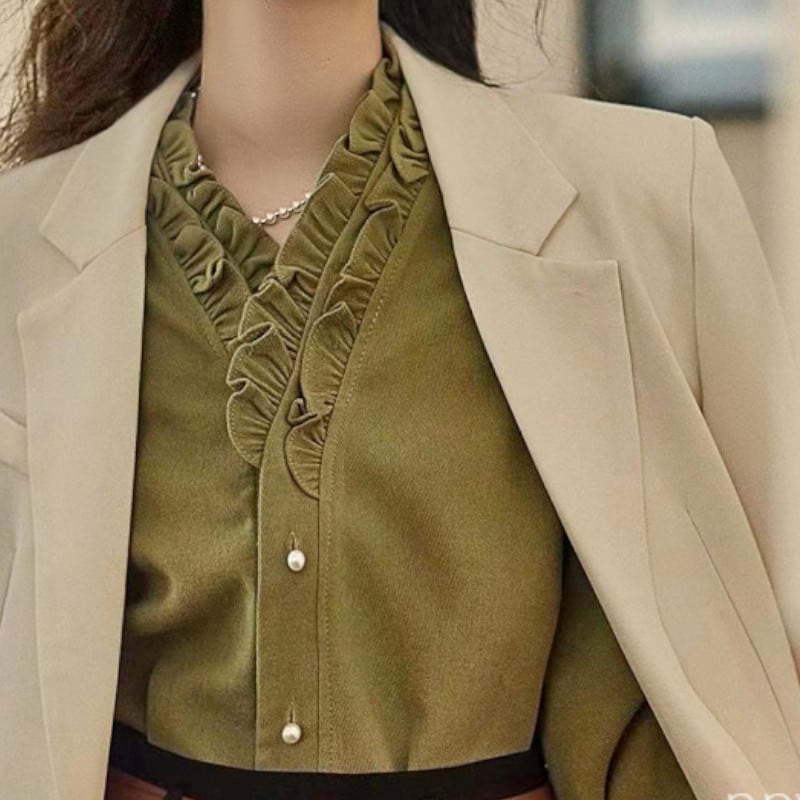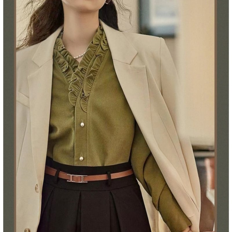 エレガントで女性らしい印象を与える、Vネックフリルシャツ。 V字の開きが顔回りをスッキリと見せ、程よいフリルが華やかさをプラス。 あたたかみのある手触りの生地で、シーズンに合わせたおしゃれを楽しめます。 《カラー》 グリーン/ベージュ 《サイズ》 S:肩幅37cm 胸囲96cm 着丈65cm 袖丈58cm M:肩幅38cm 胸囲100cm 着丈66cm 袖丈59cm L:肩幅39cm 胸囲104cm 着丈67cm 袖丈60cm XL:肩幅40cm 胸囲108cm 着丈68cm 袖丈61cm ※採寸方法により1~3cmの誤差がある場合がございます。 《素材》 ポリエステル 他 ◇人気のおすすめアイテムをもっと見る https://shop.harmonique.net/categories/5911182 ◇商品を購入する前にこちらの【ご購入前に必ずお読みください】をご確認の上お買い求めください。 https://shop.harmonique.net/blog/2024/06/25/010751 《注意事項》 *harmoniqueではお客様からのご注文を受け、お客様の商品を製作・取り寄せしております。 *基本的にお取り寄せ商品となるため、発送までに《1~3週間前後》お時間をいただいております。 *ご覧いただいているPCやスマートフォンの画面により実物と多少色合いが異なる場合がございます。 *イメージ違いやサイズ違い等、その他お客様都合によりますキャンセル・返品交換はご遠慮ください。 トップページはこちら https://shop.harmonique.net/