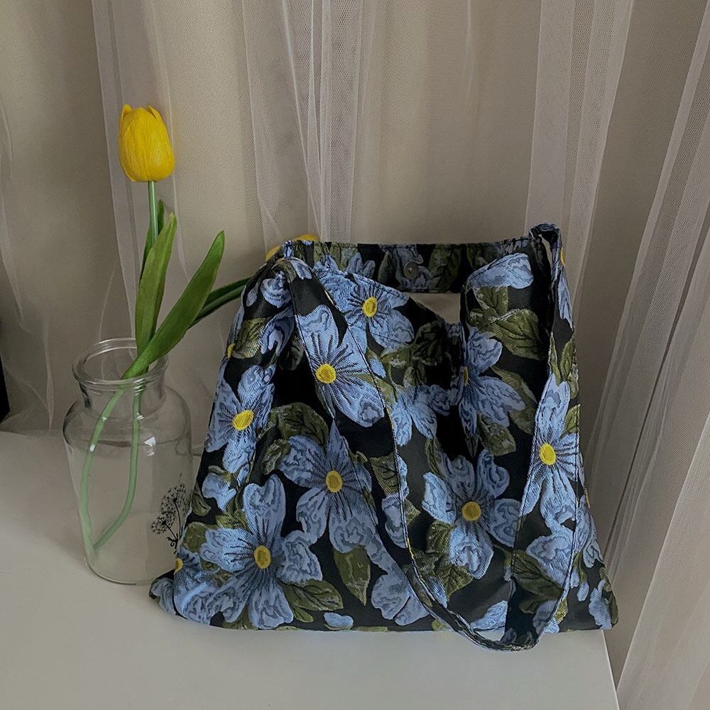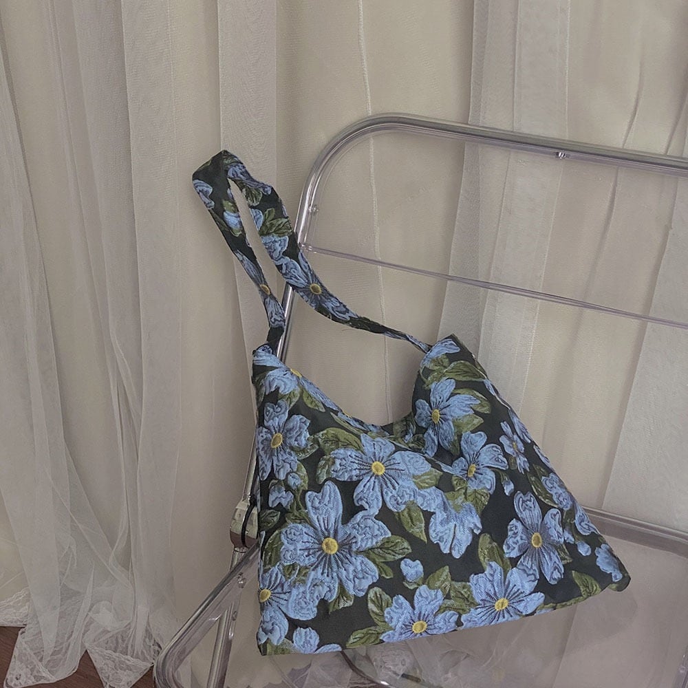 エレガントで華やかなブルーの花柄チェーンショルダーバッグ。