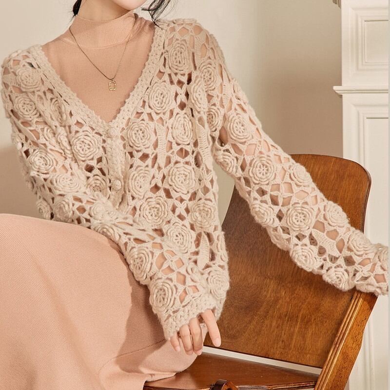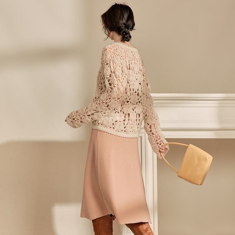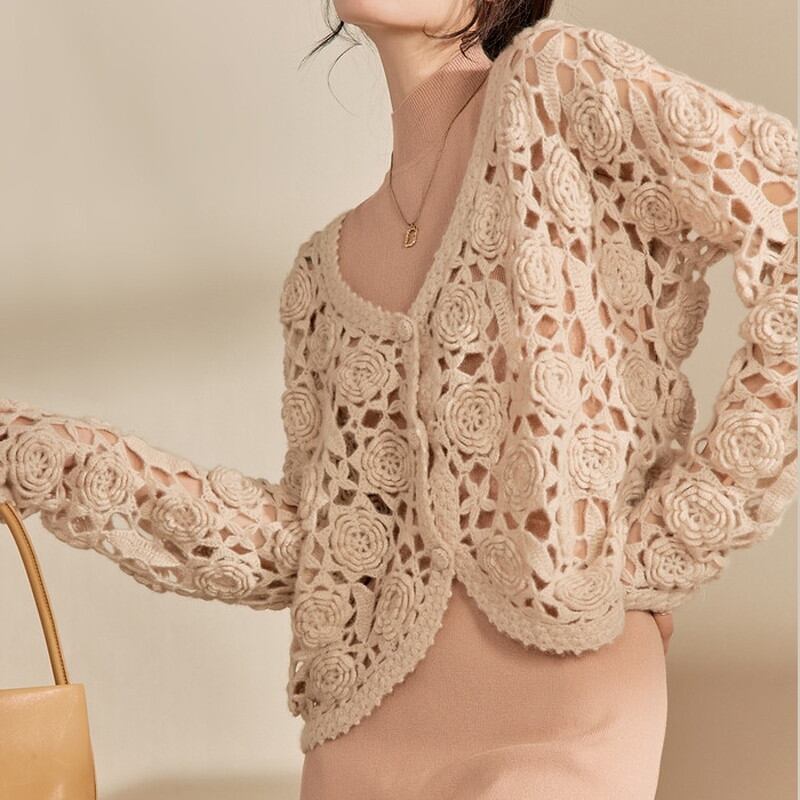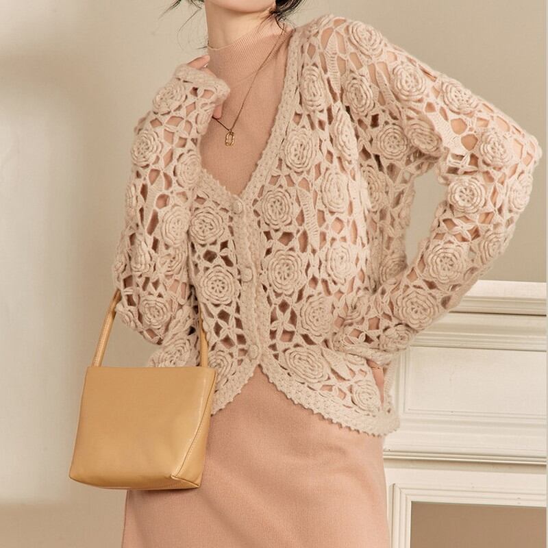 優雅なフラワーモチーフが魅力的な、透けたデザインのかぎ編みニットカーディガン。 キャメルカラーが温かみを与え、柔らかな雰囲気を演出します。 さまざまなスタイルと組み合わせやすく、デイリーコーディネートにも活躍する一枚。 《カラー》 キャメル 《サイズ》 S:胸囲108cm 着丈51cm 肩袖丈63cm M:胸囲112cm 着丈52cm 肩袖丈64cm L:胸囲116cm 着丈53cm 肩袖丈65cm ※採寸方法により1~3cmの誤差がある場合がございます。 ※モデル 身長163cm 体重45kg Sサイズ着用 ◇人気のおすすめアイテムをもっと見る https://shop.harmonique.net/categories/5911182 ◇商品を購入する前にこちらの【ご購入前に必ずお読みください】をご確認の上お買い求めください。 https://shop.harmonique.net/blog/2024/06/25/010751 《注意事項》 *harmoniqueではお客様からのご注文を受け、お客様の商品を製作・取り寄せしております。 *基本的にお取り寄せ商品となるため、発送までに《1~3週間前後》お時間をいただいております。 *ご覧いただいているPCやスマートフォンの画面により実物と多少色合いが異なる場合がございます。 *イメージ違いやサイズ違い等、その他お客様都合によりますキャンセル・返品交換はご遠慮ください。 トップページはこちら https://shop.harmonique.net/