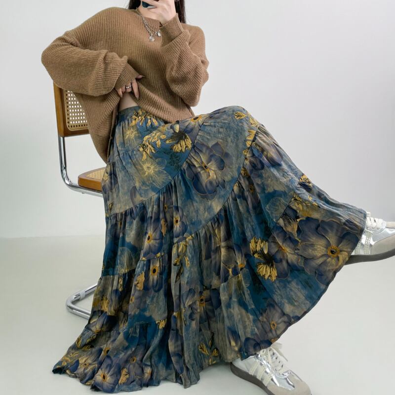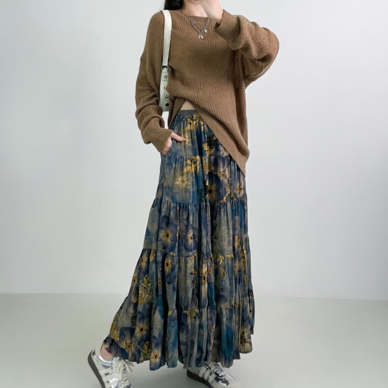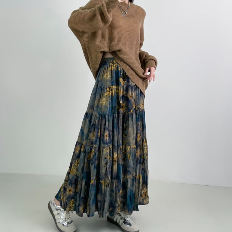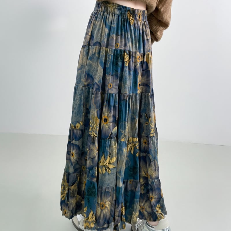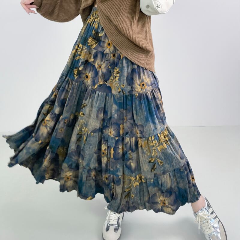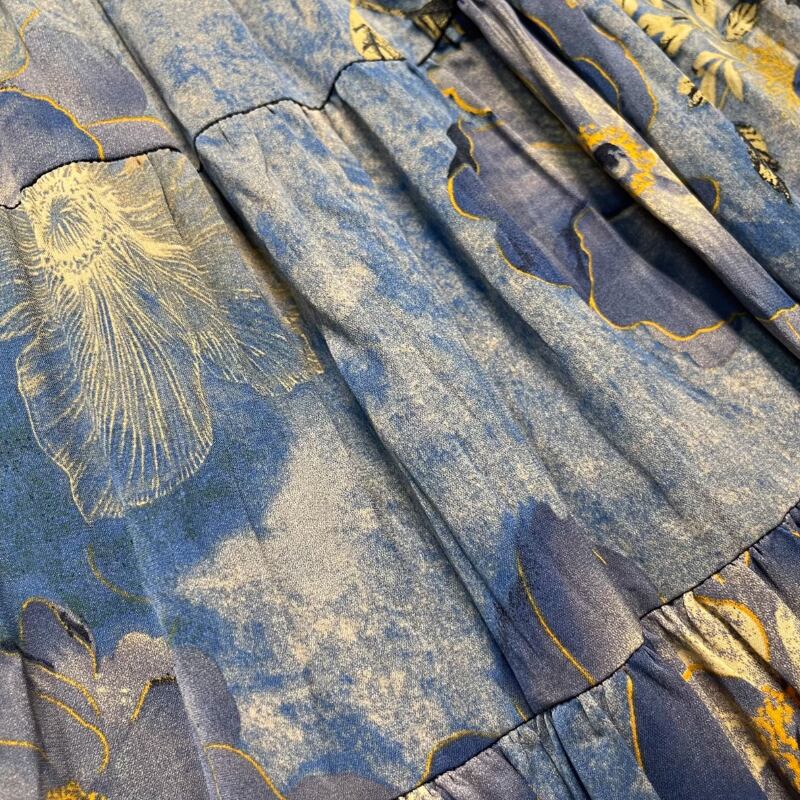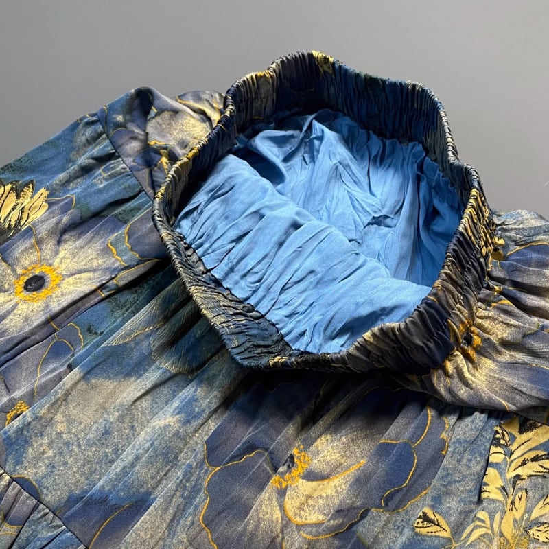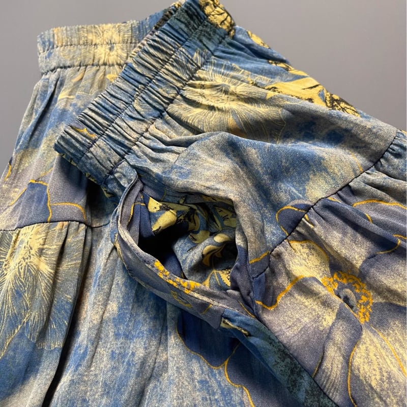 鮮やかな青色をベースに、可憐な黄色の花柄が施された、花柄プリーツAラインスカート。