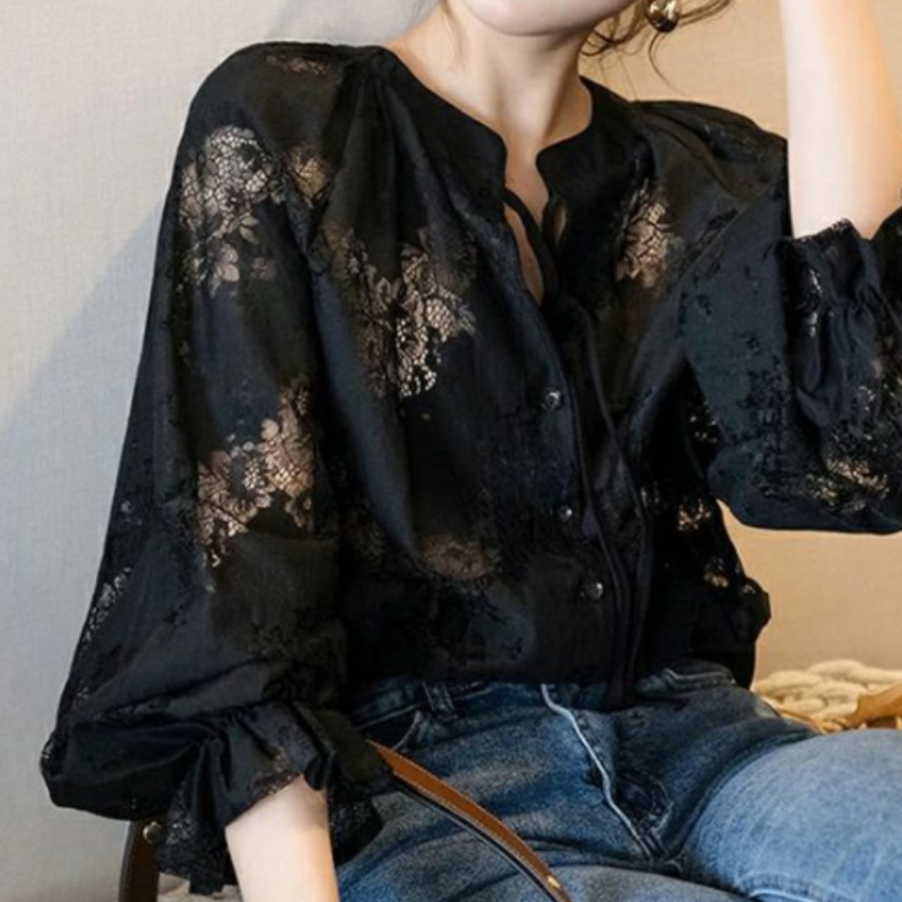 優雅な花柄レースがあしらわれた、シフォン素材のブラックシャツ。