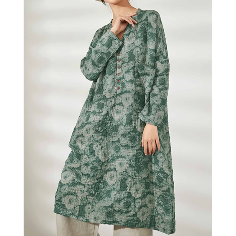 異国風味の花柄模様が目を惹く、ゆったりシルエットのミモレ丈ワンピース。