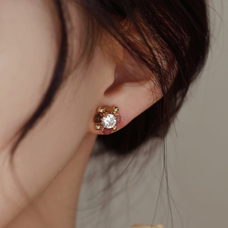 ラウンドカットの輝きを放つストーンと、華やかなフラワーモチーフが繊細に組み合わさったピアス。