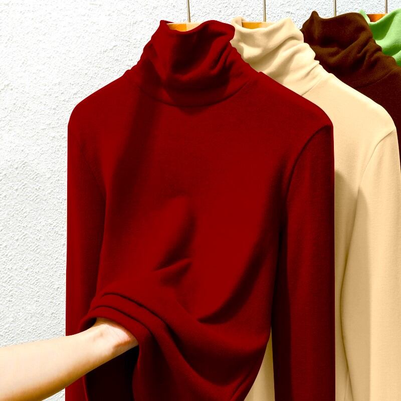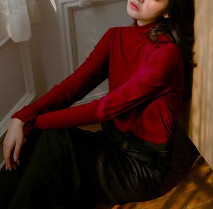 シンプルで着回し力抜群のハイネックロングスリーブトップス。